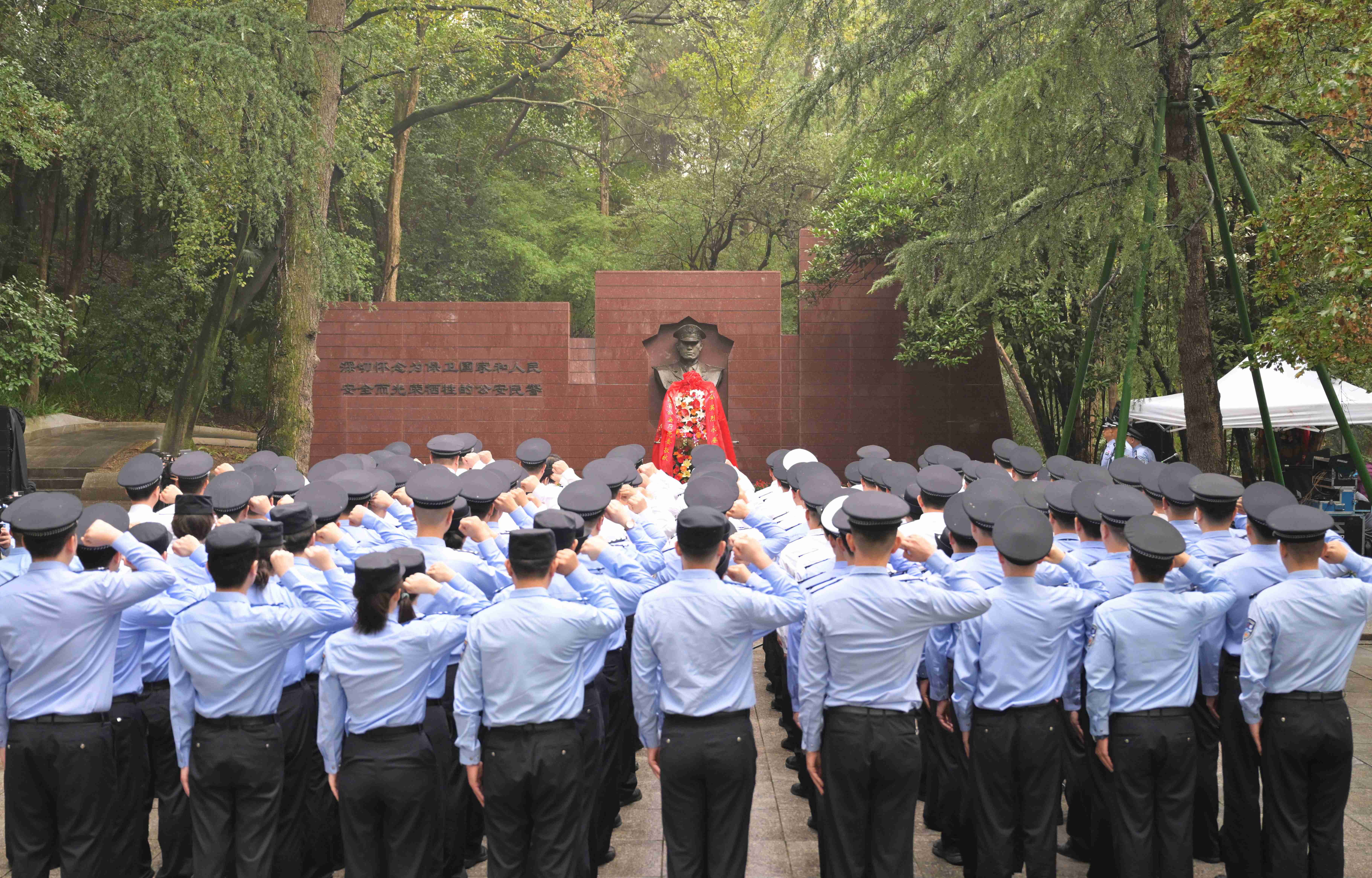 雨后的南京雨花台烈士陵园,空气格外清新,苍松翠柏环绕中,江苏公安英烈纪念墙岿然屹立。上午9时许,在宁省公安厅党委成员,特勤局和江苏警官学院党委成员,厅机关厅级干部、各部门单位主要负责人,以及民警、辅警、学警代表共百余人,在英烈墙前排成整齐的方阵,庄严肃立,齐唱国歌。国歌唱毕,全体人员脱帽致礼,向公安英烈默哀。2名仪仗队员正步向前,向英烈墙敬献花篮。全体民警重温公安机关人民警察誓词。誓言铿锵,丹心闪耀。