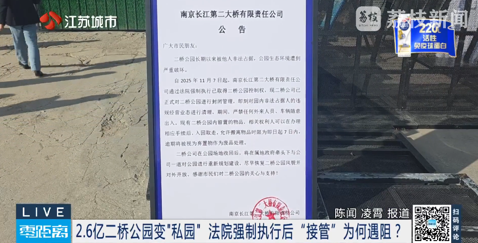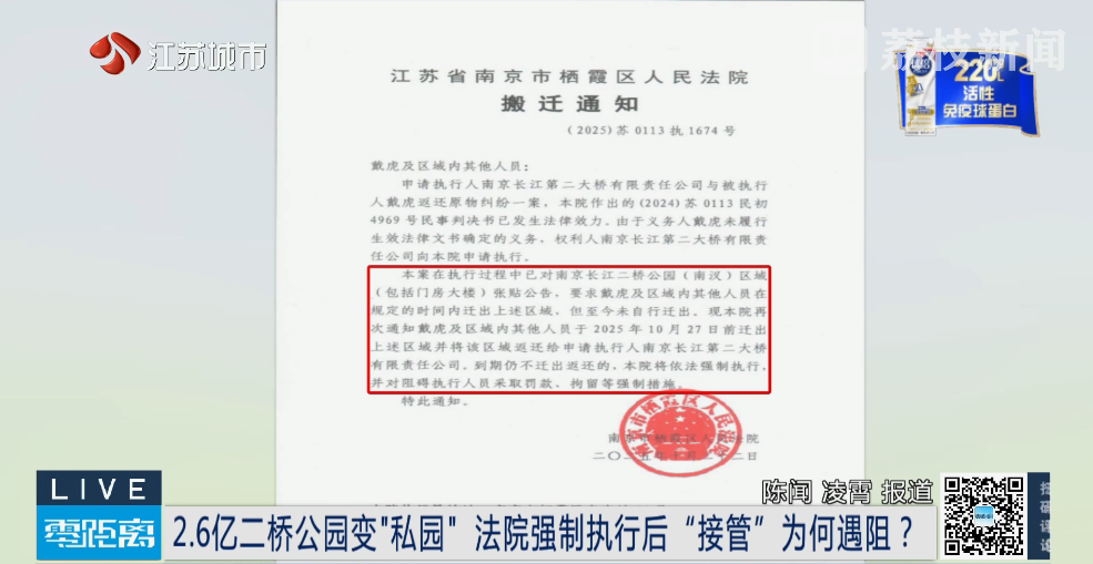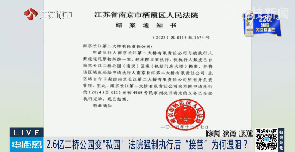 2025年11月7日,栖霞区人民法院组织执法人员来到南京二桥公园,依法实施强制执行。法院结案通知书显示:南京长江第二大桥有限责任公司与戴虎纠纷一案,被执行人戴虎已从南京长江二桥公园南汊区域(包括门房大楼)搬离,并将该区域返还给南京长江第二大桥有限责任公司,此区域自当日起由南京长江第二大桥有限责任公司所有并负责管理。