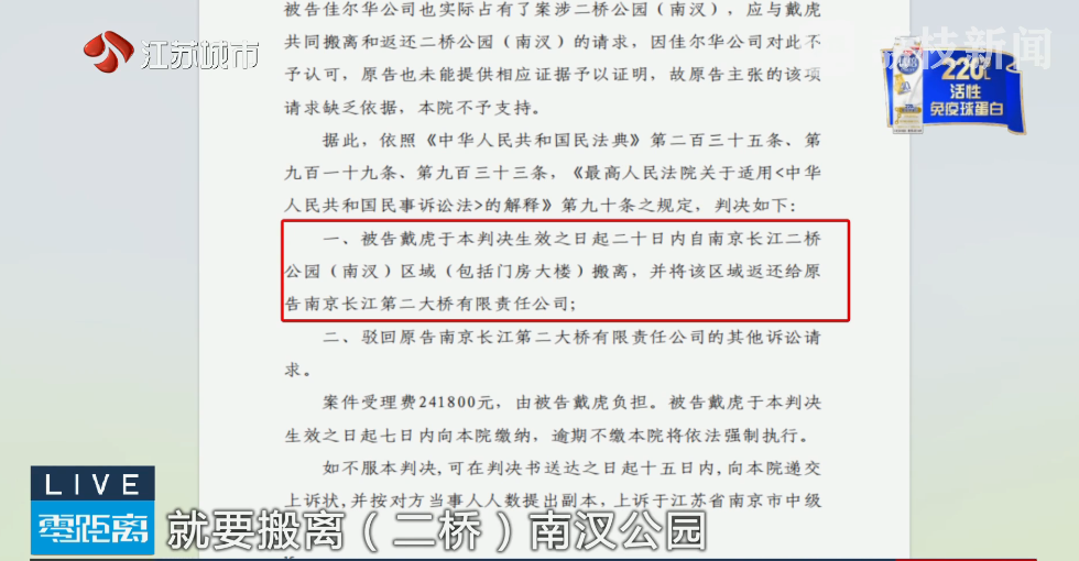 “戴虎需要在判决生效之日起,20天内搬离。”南京长江第二大桥有限责任公司代理律师彭鹏说。