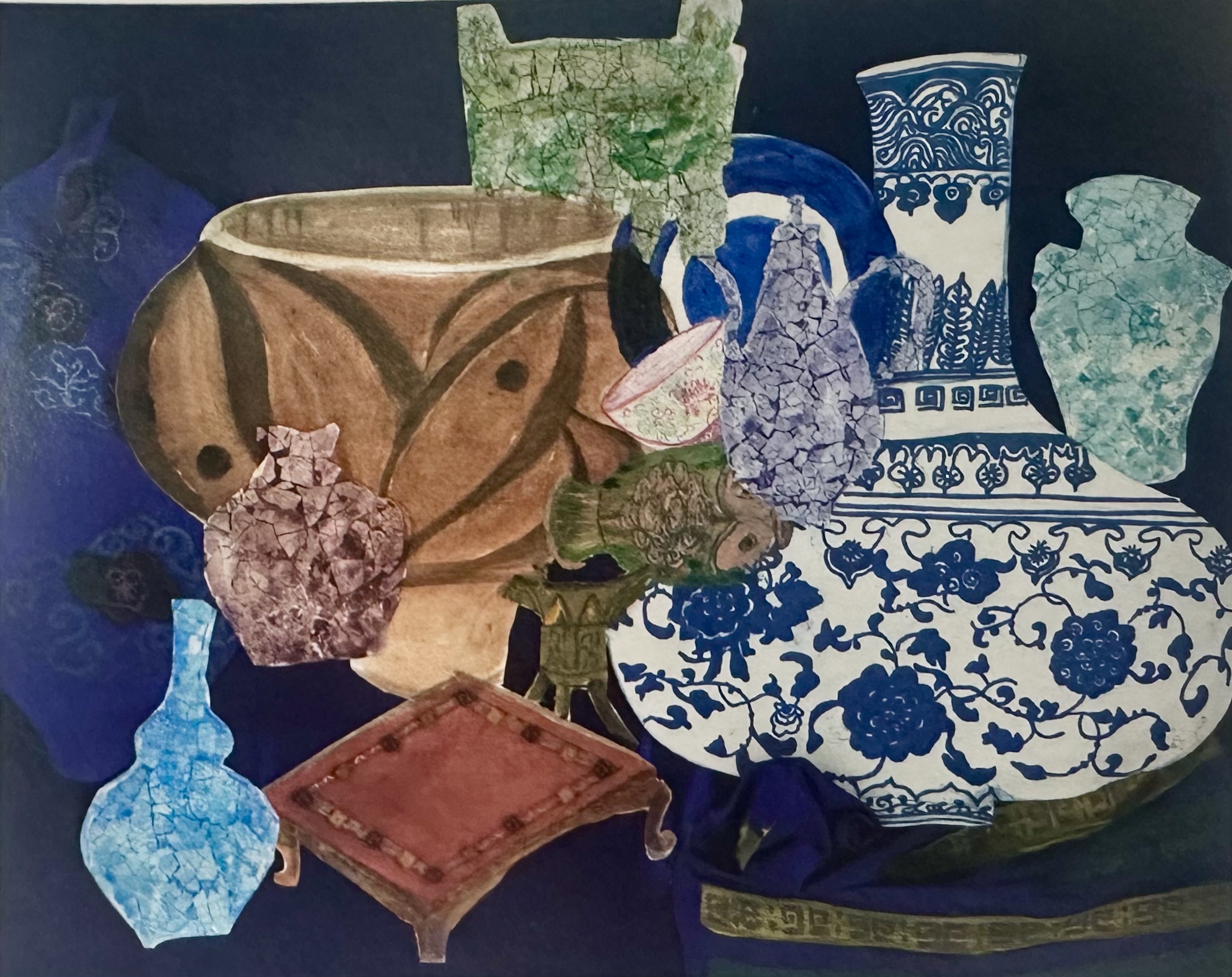 这次我指导获奖的作品名为《回归的宝藏》,当我第一次聆听学生关于这幅画的构思时,就被她的创意深深吸引。她从历史中汲取灵感,紧扣此次画展的主题,以那些曾在战火中颠沛流离、如今回归祖国的文物为切入点,表达了对历史的铭记以及对祖国文化珍宝失而复得的珍视与自豪。画面以深蓝色为背景,汇聚了多种充满中国传统韵味的器物,有充满岁月痕迹的陶器,有纹饰精美的青铜器,还有带着裂纹却依旧雅致的瓷器。孩子通过画笔,让这些承载着中华优秀传统文化的符号鲜活呈现,展现出对传统文化的热爱与传承之心。为了让这些“宝藏”更生动,她尝试采用综合材料绘画的形式,将不同材质、色彩的材料巧妙结合,营造出丰富的视觉效果,既体现了传统艺术的韵味,又充满了创新的活力。