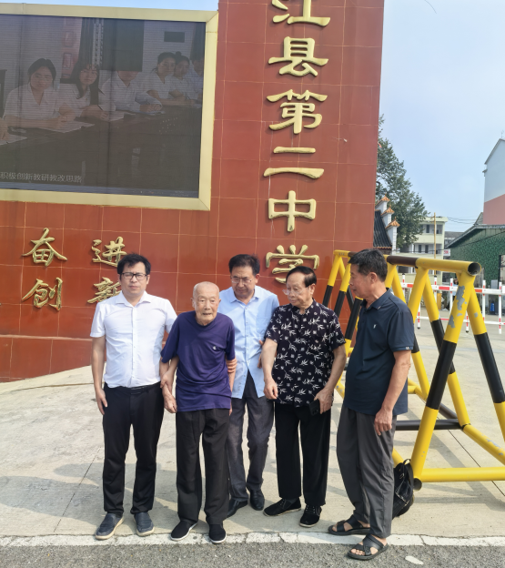 来至二中,师生笑遂颜开。二中原为庭院式建筑,有教室近百间,以走廊相连,整个学校连在一体,雨雪之天不用换鞋,可至每间教室或办公地点,当年上课以击铃为号。校内多植奇花异草,古木参天,百围千尺。而今代以楼阁嵯峨,旧貌换新颜矣。是时操场正上体育课,先生笑曰:“体育甚为重要,予当年特喜体育,为身体打下较佳基础。”见一古木葱郁,先生曰:“此树尚在,甚好!”门卫得知百岁寿星回母校参观,连忙搬来凳子,让游老坐于古树之下休息片刻,慢慢走过几座楼房,二中校领导闻知,书记兼校长周剑先生、业务副校长俞立新先生、支部副书记胡建辉先生特来欢迎,邀至学校办公室叙谈。几位领导向游老深表问候,祝先生健康长寿。周剑校长介绍改革开放以来学校取得之成就,2007年被定为湖南省牛津英语教学研究实验点及湖南城市学院教育实习基地。游老闻之,点头赞赏。校长拿出校史材料请游老过目,其中有游老任教时期之记录,对游老培桃育李所作贡献予以高度评价。游老表示,许身教育,培育英才,此生无悔。