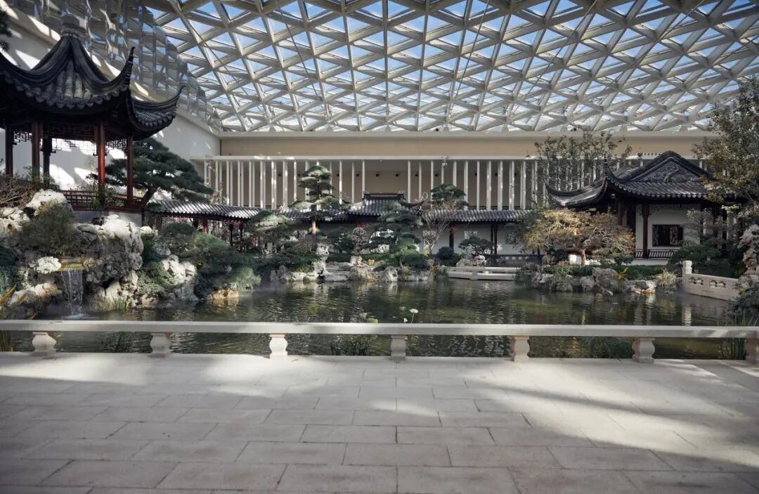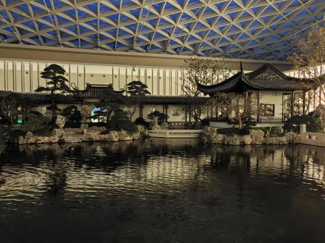 “苏园”坐落于国家会议中心二期三层峰会厅与宴会厅之间,面积约3000平方米,以“山水林园,大美中国”为设计理念,打造出“一卷三景”的整体格局:一卷:以碧水为中心,石为骨、林为脉,勾勒出一幅可行、可望、可游的山水长卷三景:以“有凤来仪”“高山流水”“国色天香”三大主题场景,营造出步移景异、意蕴深远的园林体验。