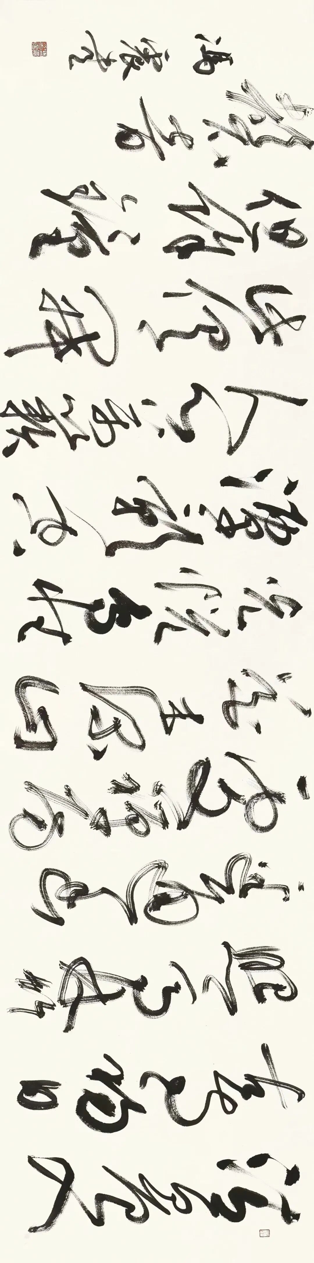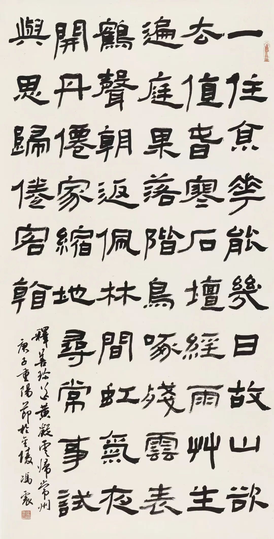 一方面,冯震借助表现形式的多元化来集聚审美倾向的纯粹性。比如,他的行草作品《常建〈题破山寺后禅院〉》,堪称是对“美是无目的的合目的性”(康德语)这一哲学命题的书法阐释。在冯震呈现的这组“认识符号”中,常建原诗“竹径通幽处,禅房花木深”的空蒙意境,已从纯粹的字里行间转化为笔墨语言下的空间美学,即以线条的浓淡枯润,来演绎“山光悦鸟性”的生态韵律;以字距行距的疏密变化,来释放“潭影空人心”的澄明感悟。特别是在“万籁此俱寂”这一句的处理上,最后一字刻意留白,其主旨是用渐淡的墨色去引燃钟磬余音,这种“不着一字,尽得风流”的匠心,正是康德所说,所谓“审美观念”就是“它生起许多思想而没有任何一特定的思想”的艺术呈现。
