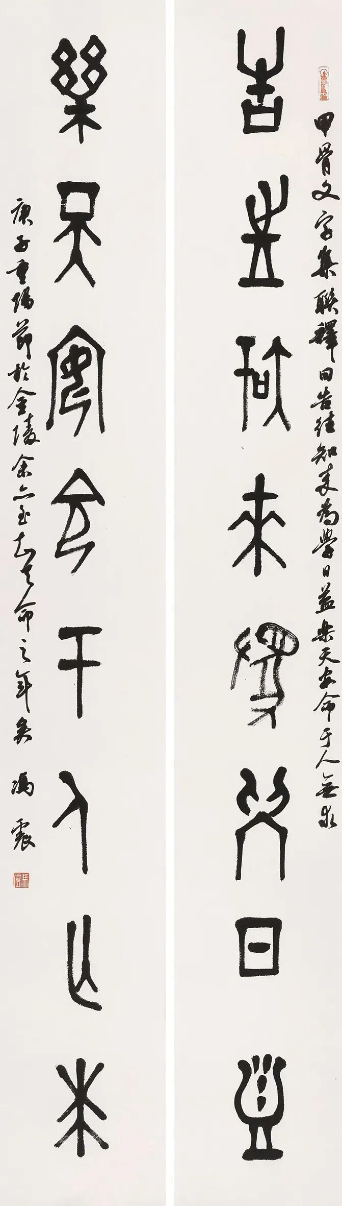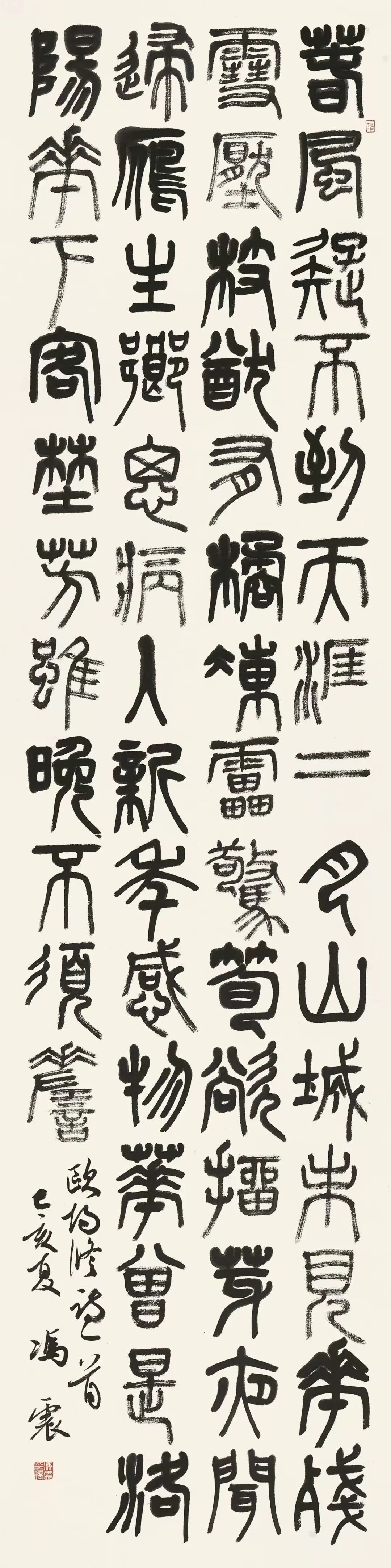 在冯震的众多作品里,我比较喜欢他的篆书。其篆书笔法与结构皆源于秦汉,主要得益于《张迁碑》的雄浑与《礼器碑》的典雅,是在“楚圆齐方”的传统范式中注入个人的理解与思索。比如,他的篆书作品《告往乐天联》,结体准确而不失灵动,偏旁部首的来龙去脉如考古报告一样清晰明了,笔墨运行的字里行间透着“轻车安徐”的从容气度。这种“不张牙舞爪”的静穆之气,正是笔者所推崇的“沧桑之形体”与“翰墨之气韵”的精华所在。在这里,前者指向书法的历史厚度,后者彰显艺术的生命活力。因此,当我们将冯震的篆书与黄惇先生的金石风格进行比对时,可见师门传承中的“基因重组”十分耀眼。