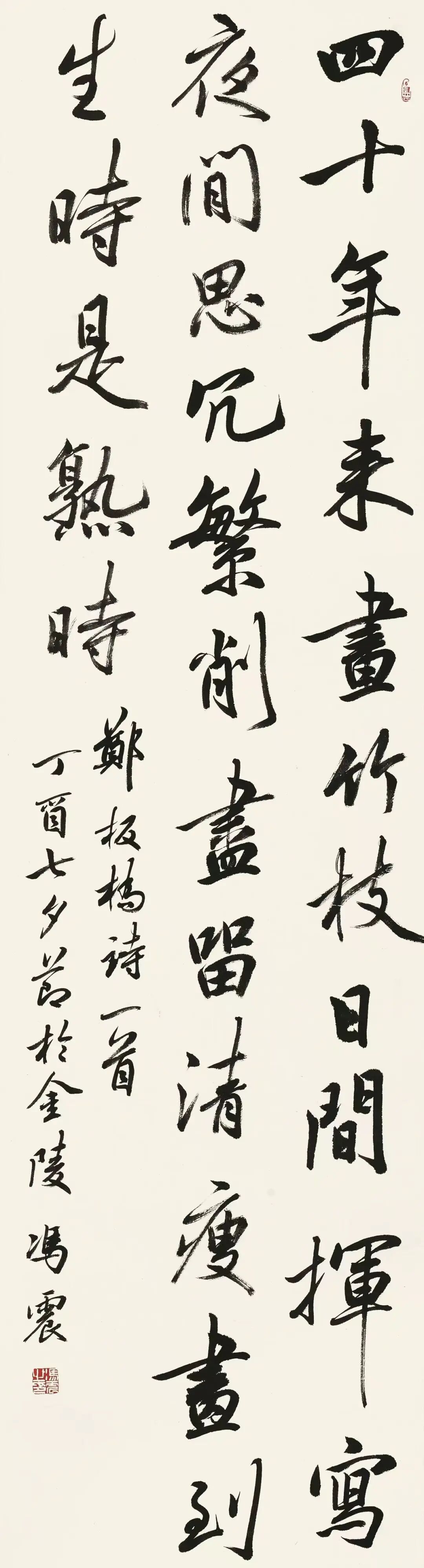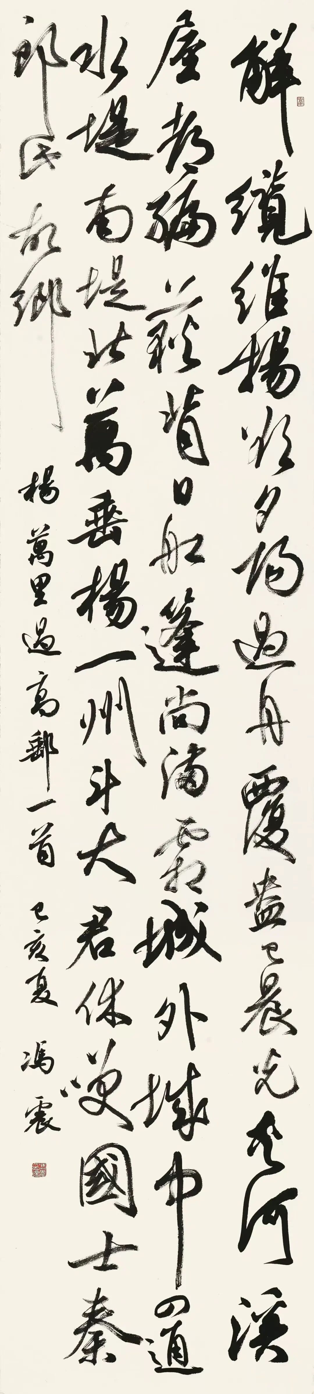 书法是笔墨精神的物化,是历史文化的缩影。当我们将冯震的书法置于更广袤的文化视野来审视,会发现他正站在一个独特的美学坐标上:纵向,承接了郑板桥“删繁就简三秋树”的文人精神;横向,融汇了康德“审美判断力”的哲学智慧。他的作品虽然还有诸多遗憾和不足,但其如同一条纽带,一头连着中国传统的“意境说”,一头接着西方现代的“形式美”。他于无声处,于现实笔墨的浓淡干湿之中,演绎着历史哲思的美学命题。