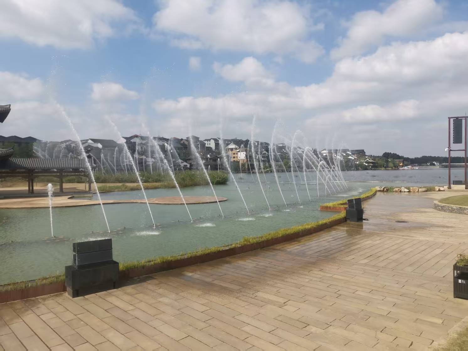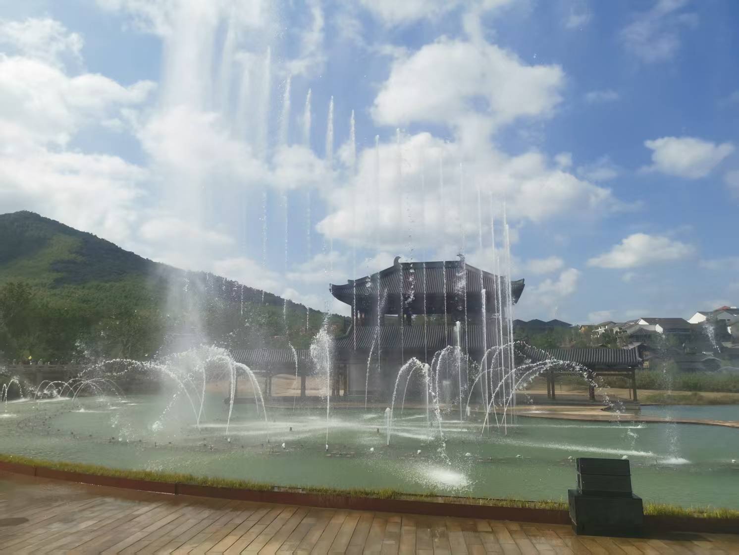 导游带领我们首先观看龙形水秀表演。优美动听的音乐和歌声伴随着各种形状的巨型喷泉展现眼前,气势恢宏,令人惊叹,尤如一场盛大的歌剧表演。一会儿高达数十米的水柱冲天而起,发出噼噼啪啪的响声,像是在燃放烟花爆竹;一会儿喷出弯弯曲曲、婀娜多姿的水带,恰似一条条水龙在空中飞舞,表演着各式各样的舞蹈。大家在视角和听角的冲击下兴奋不已,不停地用手机拍下这难以见到的场景。据介绍,窑湖小镇水秀表演采用定制研发的灯光芯片和进口灯珠,通过精密算法控制,在水、火、光、乐的结合下,呈现出“神龙摆尾”“飞龙啸天”“神龙戏珠”等独特的视听妙趣。以编舞艺术家的理念为灵感,每一根水柱都如拥有生命力的演员,模拟出水的独舞、组舞、群舞,时而轻盈飘逸,时而气势磅礴。观看龙形水秀表演的最美最佳效果是在晚上,仰望喷泉,仿若与天幕相连,在天幕之下犹如天上银河,又似绿野精灵,远眺青黛山峦,近观窑湖银波与小镇烟光,目间万物都是动起来的状态,置身于此是绝对的视听享受。