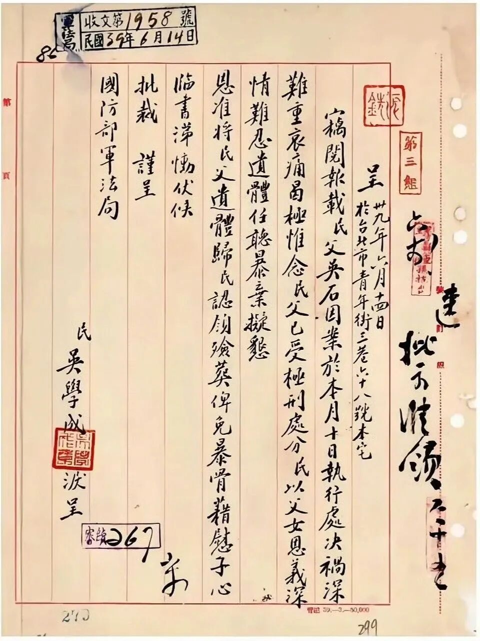 窃阅报载,民父吴石因案于本月十日执行处决。祸深难重,哀痛曷极。惟念民父已受极刑处分,民以父女恩义深情,难忍遗体任听暴弃,拟恳恩准将民父遗体归民认领殓葬,俾免暴骨,藉慰子心。临书涕恸,伏候批裁。谨呈国防部军法局。民吴学成泪呈。