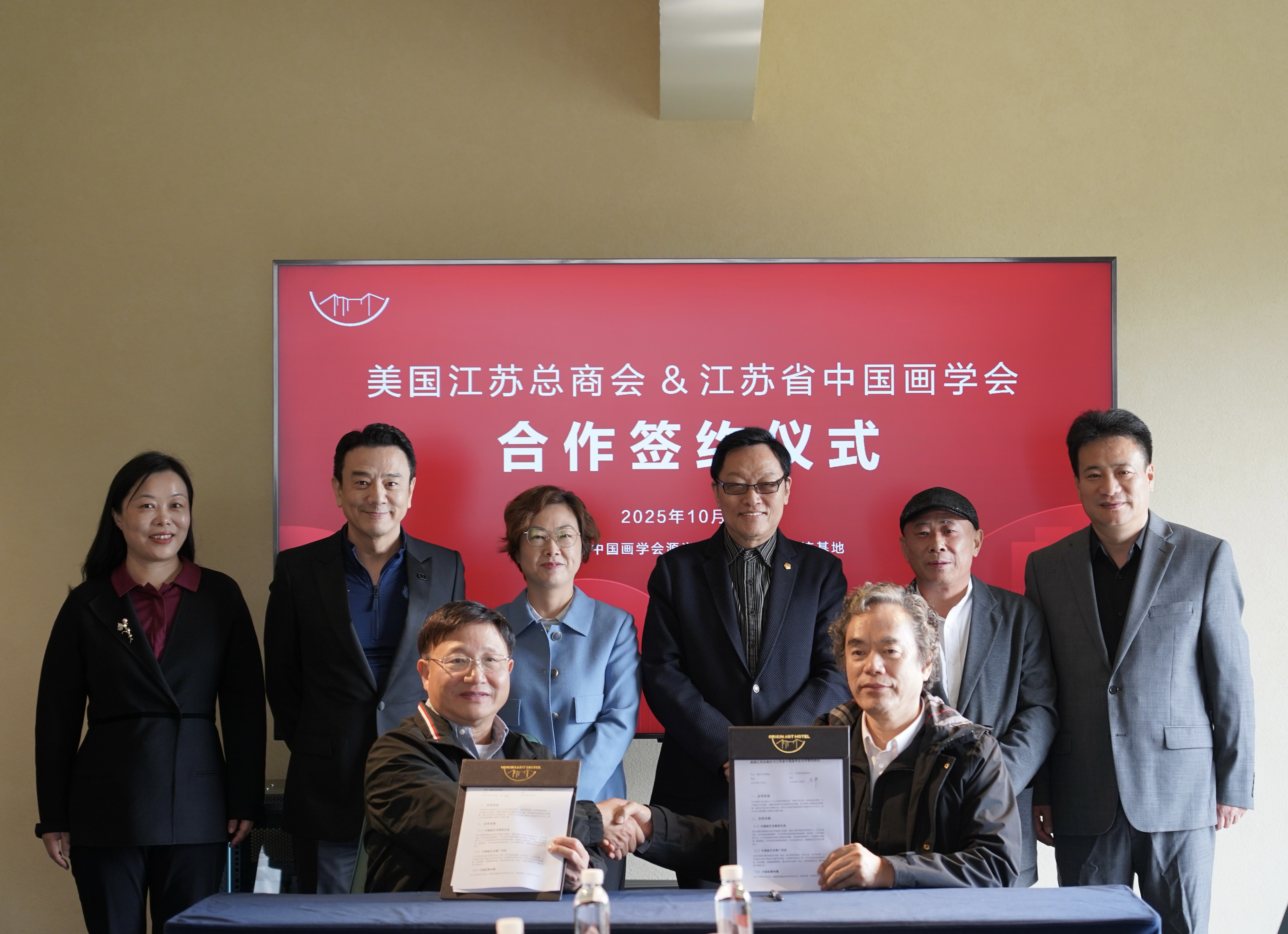 随后,美国江苏总商会秘书长王毅与江苏省中国画学会副会长王平代表双方签署战略合作协议,现场领导共同见证这一重要时刻。掌声中,签约代表与见证领导合影留念,定格下中美文化合作的珍贵瞬间。