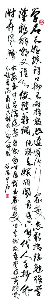 先生在众多的社会赞扬面前经常说:“我是少无大志、见异思迁、不务正业、无家可归。”这十六字真言,包含了老子《道德经》的“不争”之“争”,也囊括了自守谦逊的“不中”之“中”(先生写字落款为“中石”,画画落款为“石中”,“石中”的章草写法呈“不中”字形),不愧为哲学泰斗金岳霖先生的高足名徒。