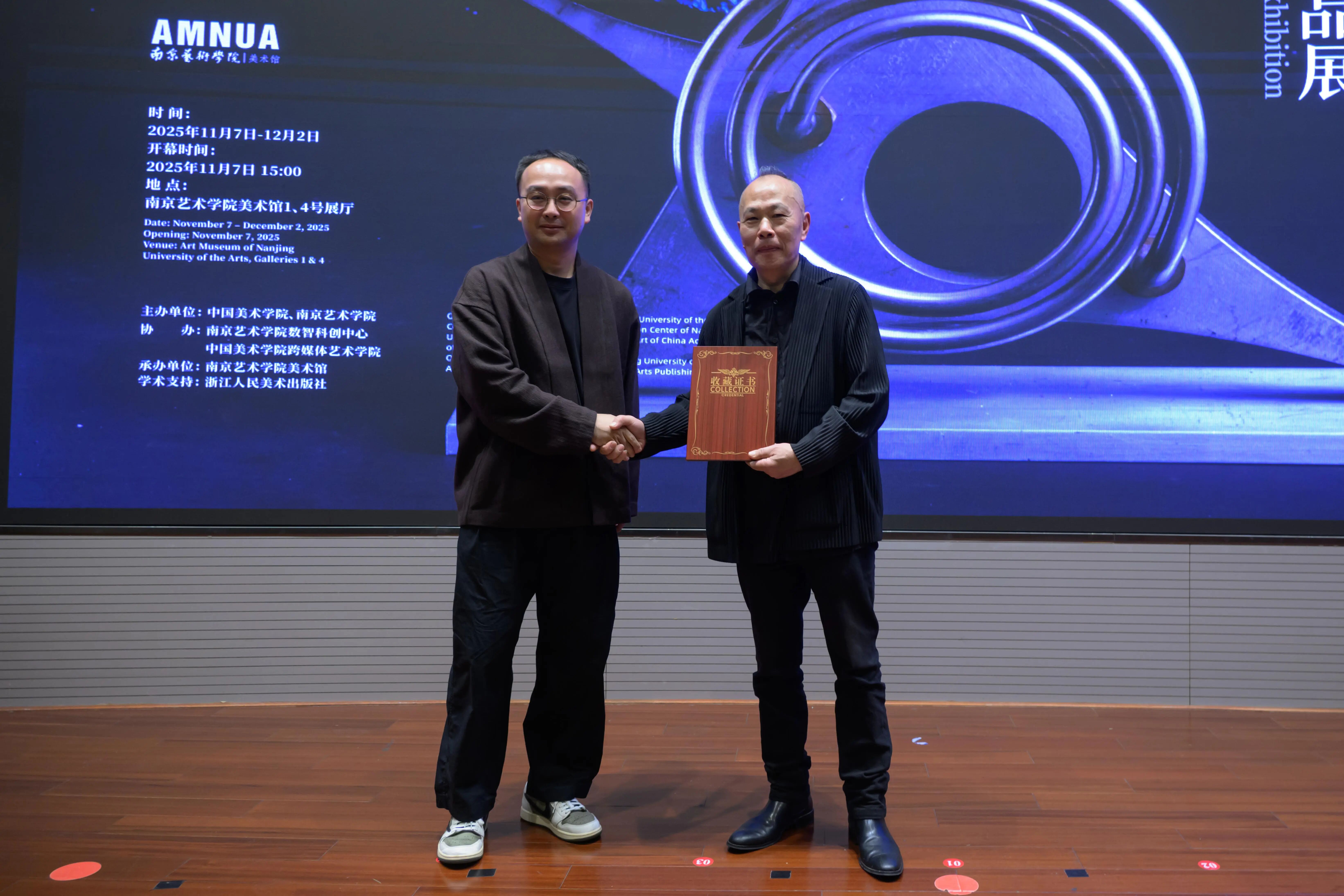在开幕式上,管怀宾教授将其代表作品正式捐赠予南京艺术学院美术馆,南京艺术学院美术馆副馆长林书传代表南艺美术馆接受捐赠。