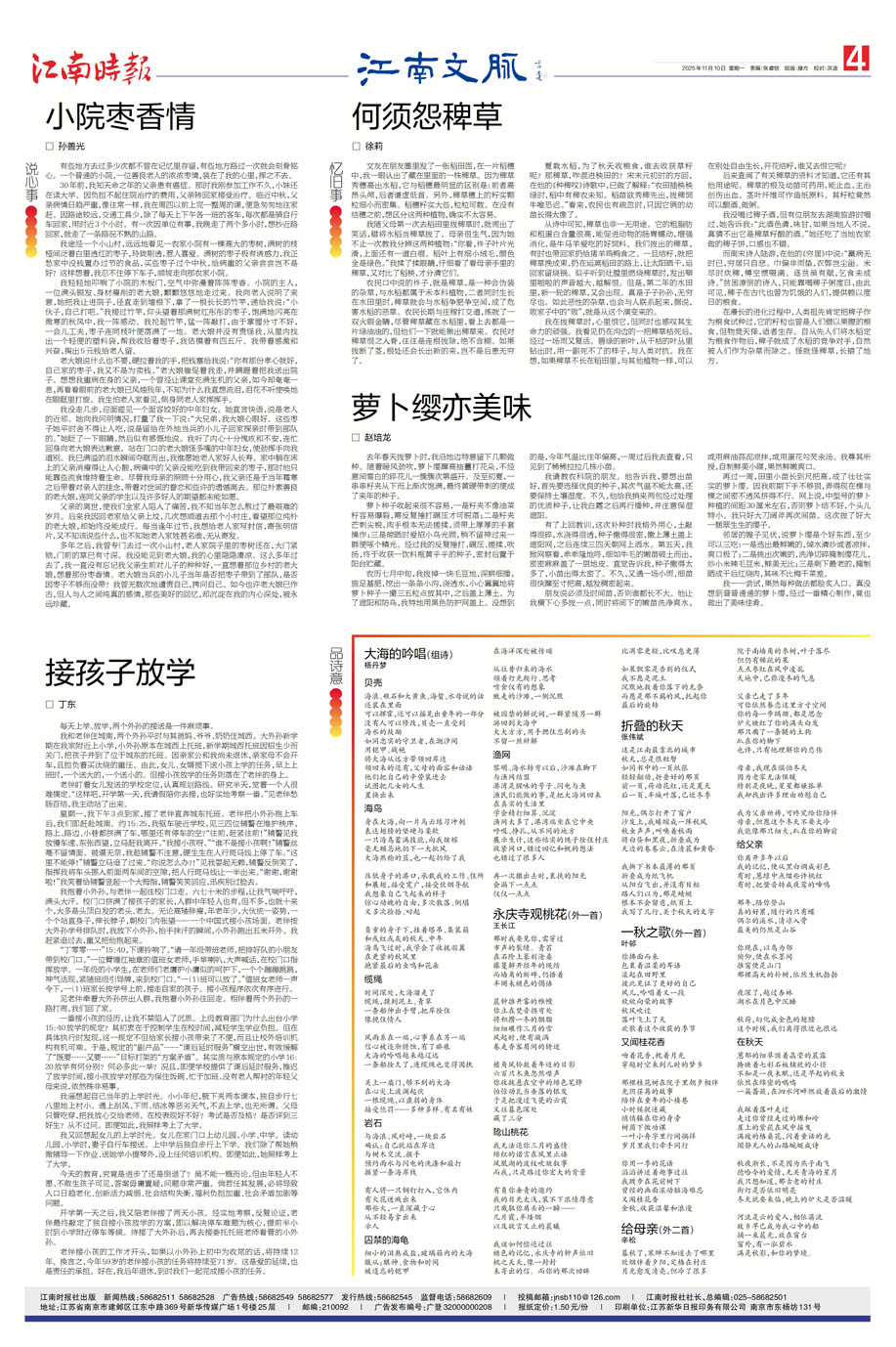 我轻轻地叩响了小院的木板门,空气中弥漫着阵阵枣香。小院的主人,一位满头银发、身材瘦削的老大娘,颤颤悠悠地走过来。我向老人说明了来意,她把我让进院子,径直走到墙根下,拿了一根长长的竹竿,递给我说:“小伙子,自己打吧。”我接过竹竿,仰头望着那满树红彤彤的枣子,饱满地闪亮在微寒的秋风中,我一阵感动。我抡起竹竿,猛一阵敲打,由于掌握分寸不好,一会儿工夫,枣子连同枝叶便落满了一地。老大娘并没有责怪我,从屋内找出一个轻便的塑料袋,帮我收拾着枣子,我估摸着有四五斤。我带着感激和兴奋,掏出5元钱给老人留。