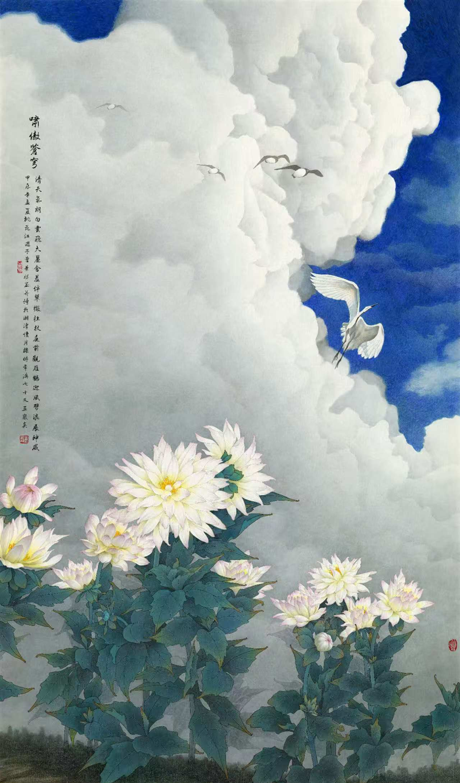 工笔以加法作画,写意以减法作画,而诗意的表达,哲思的抒遣,殊途而同归。林凡是卓越的工笔画家,他倡言“意工”说,所谓“意工”,是技法之精湛与意境之幽深和谐统一。曾景祥的创作以工于技、工于意取胜,线条、色调、意象、构图无一不是千锤百炼、镂情刻意而来。曾景祥的花鸟远取黄筌、李公麟等古代大家,近学陈之佛、于非闇等近现代名家,对宋人花鸟画研究尤为深入,又从油画、水彩中吸取丰富营养,而真正进入艺术创作又能泯来痕迹,技可游刃,新人耳目。从画作本体意象而言,大丽花的鲜活、素洁、欣荣与天宇的蔚蓝、白云的飘荡、白鹤的独啸、大雁的奋翼构成内在的呼应,异卉的静反衬了灵羽的动,白云的轻盈缥缈反衬了天宇的浩瀚清宁。花之妍、云之飘、天之蓝、鸟之飞构成一幅天地一色、万类自由的秋景图。此画借用山水竖构图之形式,似见高远之势突兀、深远之意重叠、平远之意冲融而飘飘渺渺之美感特征。画作落款以瘦劲雄健之楷书,更增添了整个画境的雄浑感、清宁感。画作的题诗为点睛之笔,对画境的联想空间作了精准的点化,让人油然想到“振衣千仞冈,濯足万里流”(左思诗句)的超旷之境。整个画境应是化用刘禹锡《秋词》“晴空一鹤排云上,便引诗情到碧霄”的诗意而来,而格调风神似比刘词更超旷伟丽,静谧灵和。