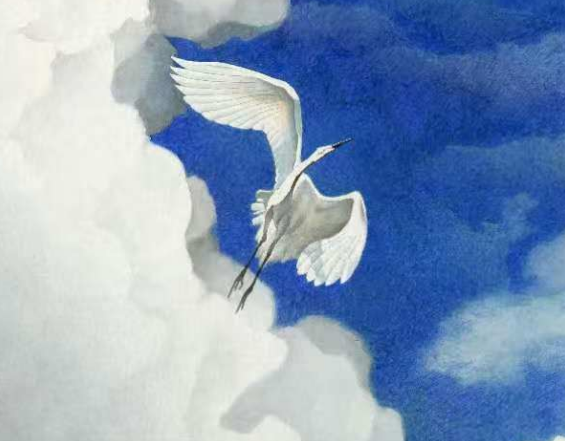 画题暗示的核心意象是指冲霄之鹤和奋翼之雁。白鹤是道家文化中的神鸟,吉祥长寿的象征,《诗经·小雅·鹤鸣》之中就有“鹤鸣于九皋,声闻于天”的千古名句。你看,白鹤在蓝天白云中奋翼,昂首舒翼,伸足张目,穿云破雾,奋勇凌霄,似乎在丈量着天地间的距离。仿佛每一次振翅,都带着超脱尘世之韵律;每一次鸣叫,都表达了必胜的信念。那洁白的羽毛,在阳光的映照下,闪烁着圣洁的光芒,似乎又带着一种不可侵犯的孤傲,如一道白色的闪电划破长空。宛如一位无畏的勇士,在广袤的天宇驰骋,仿佛在向世界宣告其胸次之博大,志向之高远,意志之坚毅。鸿雁在中国文化中象征思乡怀亲、忠诚守信、团结协作、自由高远,《诗经·小雅·鸿雁》:“鸿雁于飞,肃肃其羽。”画家笔下的白鹤与鸿雁灵犀相通,向同一方向奋飞。它们追求共同的目标,在天空中书写拉长倾斜的逗号,声音与白鹤应和,构成壮美的旋律在回荡。鹤雁奋翼的情景让人想到庄子《逍遥游》中对大鹏形象的描写:“鹏之徙于南冥也,水击三千里,抟扶摇而上者九万里,去以六月息者也。”白鹤、大雁、长鹏,都是抒情写意的符号,是生命意志、时代精神的具象表达。