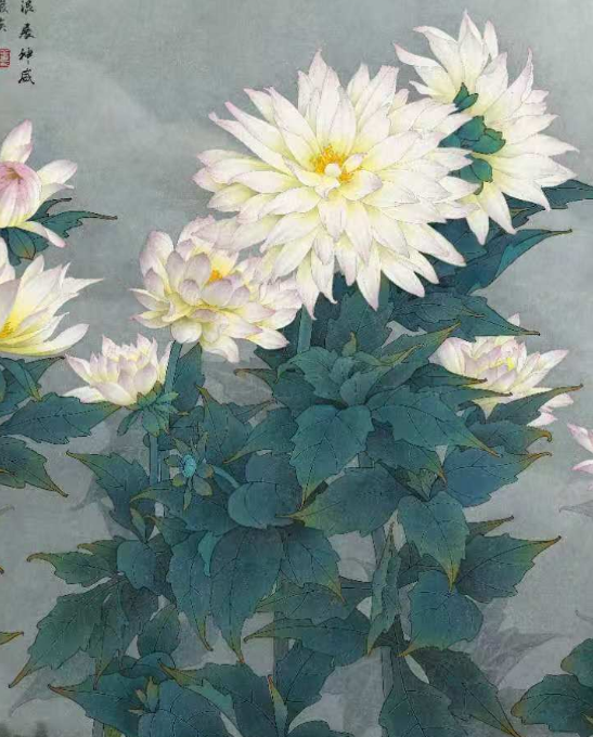 凝视衬托意象,大丽花生机勃勃,素洁妖娆,国色天香,闪烁着一种淡雅高华的清光。以大丽花为审美对象体现画家独特的审美目光。大丽花仿佛集牡丹、芍药、莲花、菊花之美于一体,虽来自海外,早已是中华花族中的一员。画家对我说:“我的艺术理念唯意为尚,唯美为尚,不薄西方爱东方,不薄现代爱传统,鲁迅的‘拿来主义’是正确的。”这与林凡的观点一致。艺术创作根植传统并非拘守传统,应在不断优化中实现超越。美是人类的共同追求,从独特选材就可读出画家广阔深远的审美目光。所绘大丽花者九,整株七,折枝二;所绘花朵十二,硕大者二,正面朝阳者六,侧面绽开者四,含苞待放者二。花朵或高或低,或大或小,或傲然绽放,或含羞初开,或打着花骨朵儿。花瓣雪白如玉,从形态中读出一种生命的力感。鹅黄的花蕊似带露珠,鲜活灵动。由花枝的雄劲,花叶的稠密,花形的多姿,花色的素洁,花蕊的鲜妍,可读出生气的欣荣,景色的绚烂,力感的雄强,油然想到画家对故园的眷恋,对诗意的陶醉,对时代精神的讴歌。