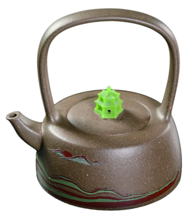 诗人王之涣用“唐代五言绝句之最”的绝唱照亮千年,当代吕尧臣大师以鹳雀楼为壶钮,壶身上以绞泥技艺描绘出波涌浪飞的黄河,远处,斜阳依山,一道提梁横跨在上,将壮阔雄浑景色融为一体,形成一幅粗犷明快、意境深远的山水画。壶名《高瞻远瞩》,点明诗中阐发的朴素明快而意义深刻的哲理。作品形体虽小,但豪放雄劲,气势磅礴,渗透着昂扬向上的奋进精神,体现了对美好事物的向往与追求。