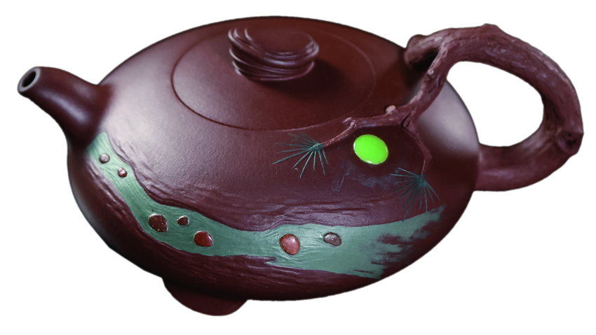 一把壶,便是一首诗、一幅画。《清泉》以紫砂语言,再现了唐代诗人王维名句“明月松间照,清泉石上流”的清幽明净景象。壶以“松林”“清泉”“山石”等意象组合,最为别致的是松林间以夜光宝石为材质的一轮明月,澄澈宁静,空灵高洁。