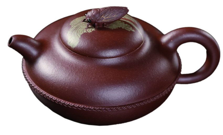 《秋蝉》属于传统艺术题材中的“蕉叶蝉”。白石老人笔下的“蕉叶蝉”,把写意与工笔画有机结合在一起,意象清灵,仿佛可以听到它那带着一丝幽然凉意的断续鸣声。吕尧臣将白石老人平面的“蕉叶蝉”化为立体的画,绞泥制成的蕉叶纹平铺在壶盖、壶身上,壶钮“蝉”俏生生地立在蕉叶上,这里的蝉“含气饮露,黍稷不享”,清雅高洁,韵致悠长,大有君子之风。唐代诗人戴叔伦《画蝉》中的句子“饮露身何洁,吟风韵更长”,简直是为其量身定制的。
