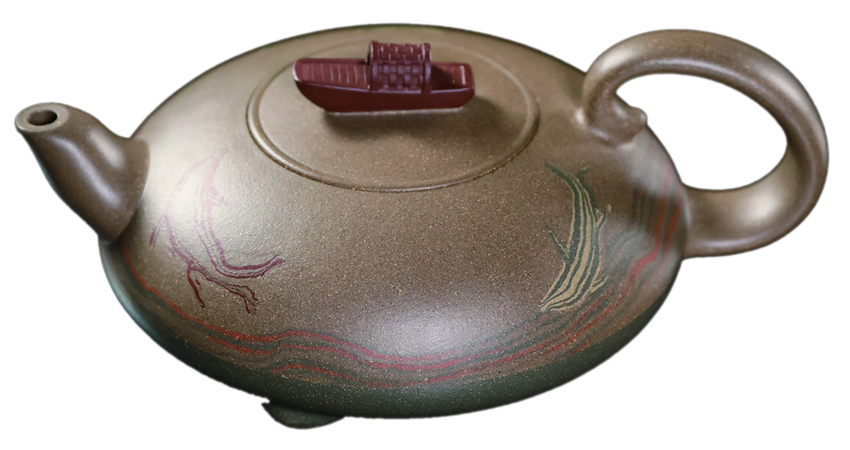 壶钮是一条简朴的小船,仿佛在等待主人的归来;涓涓清流,小舟自横,鱼儿跃然,描绘出人与自然和谐共生的画面;配上舒缓的三弯嘴、卷扬的壶把,整件作品造型舒展,意象纯真,风格质朴。