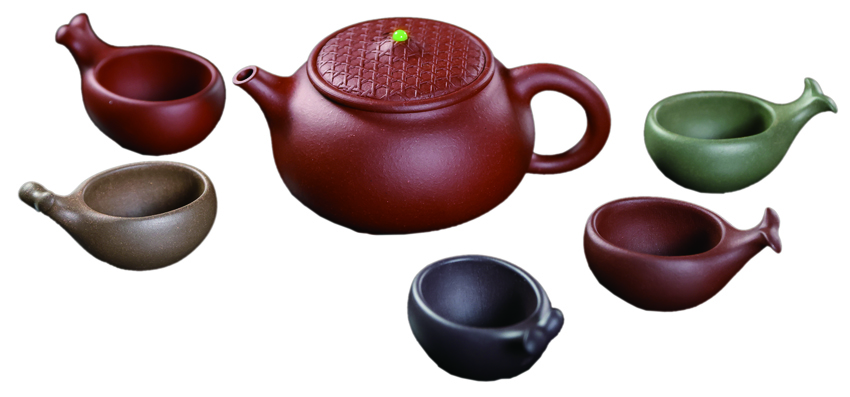 该套作品一壶五杯,壶的主体原型其实是渔翁,蓑衣斗笠,稳踞中央,鱼形杯则灵动地散布四周,一静一动,意趣盎然,方寸之间营造出水乡的意境。一竿风月,一壶清茶,大道至简,万古风流。吕尧臣以此一壶,将茶人与渔人的精神境界融为一体,逍遥天地之间,是曰“仙翁”。