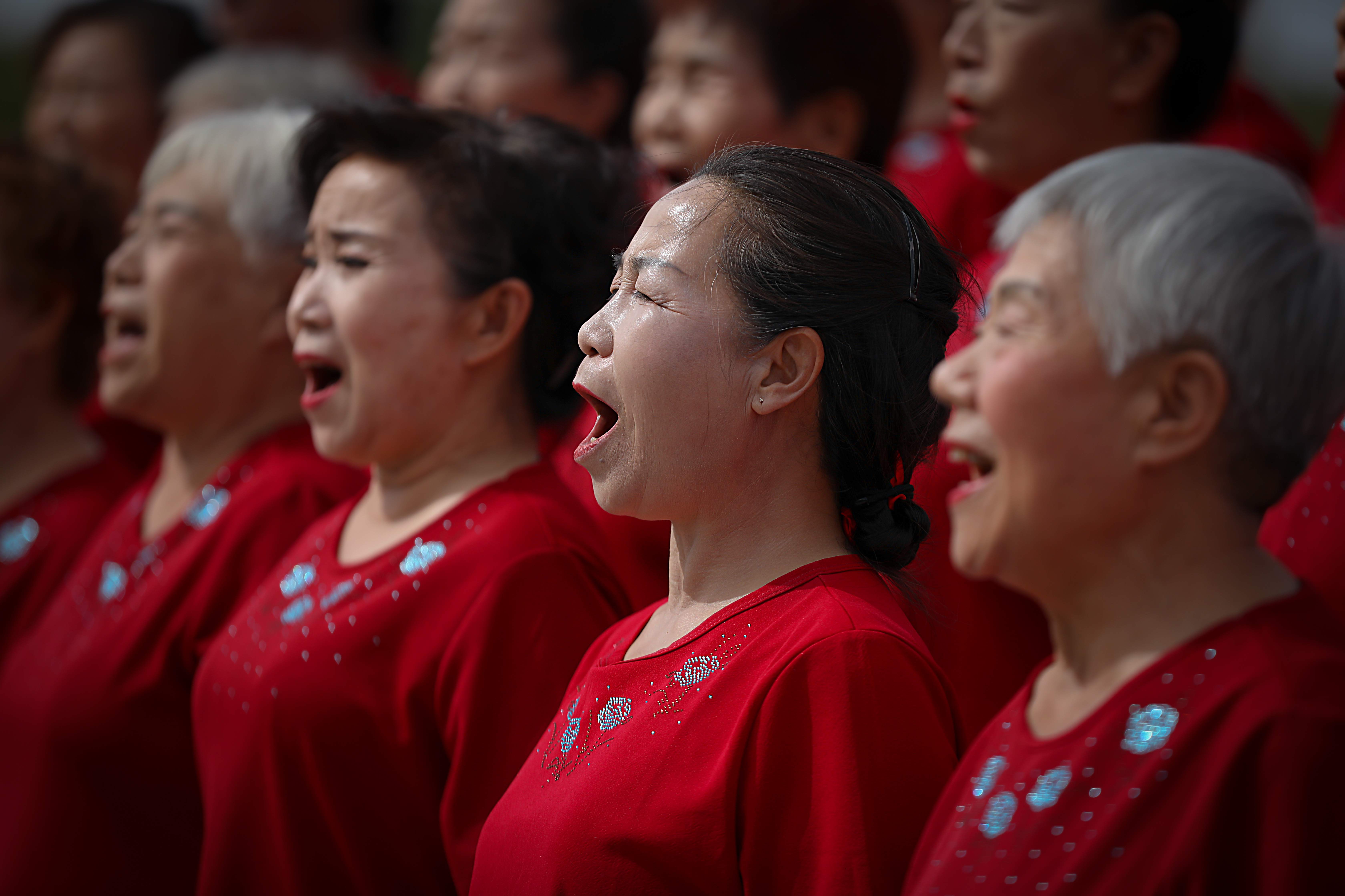 《永恒的兵团精神》新疆兵团第十三师新星市红星二场金色阳光社区综合服务中心一楼排练室,老年红歌队正排练歌曲《地窝子有话说》,队员们整齐划一,精神饱满。这支老年红歌队由社区50名退休职工组成,平均年龄65岁。荣获过“第八届全国服务农民、服务基层文化建设基层文艺院团先进集体”称号,如今服务中心已成为职工群众踊跃参与的文艺之家。(吉龙生 摄)