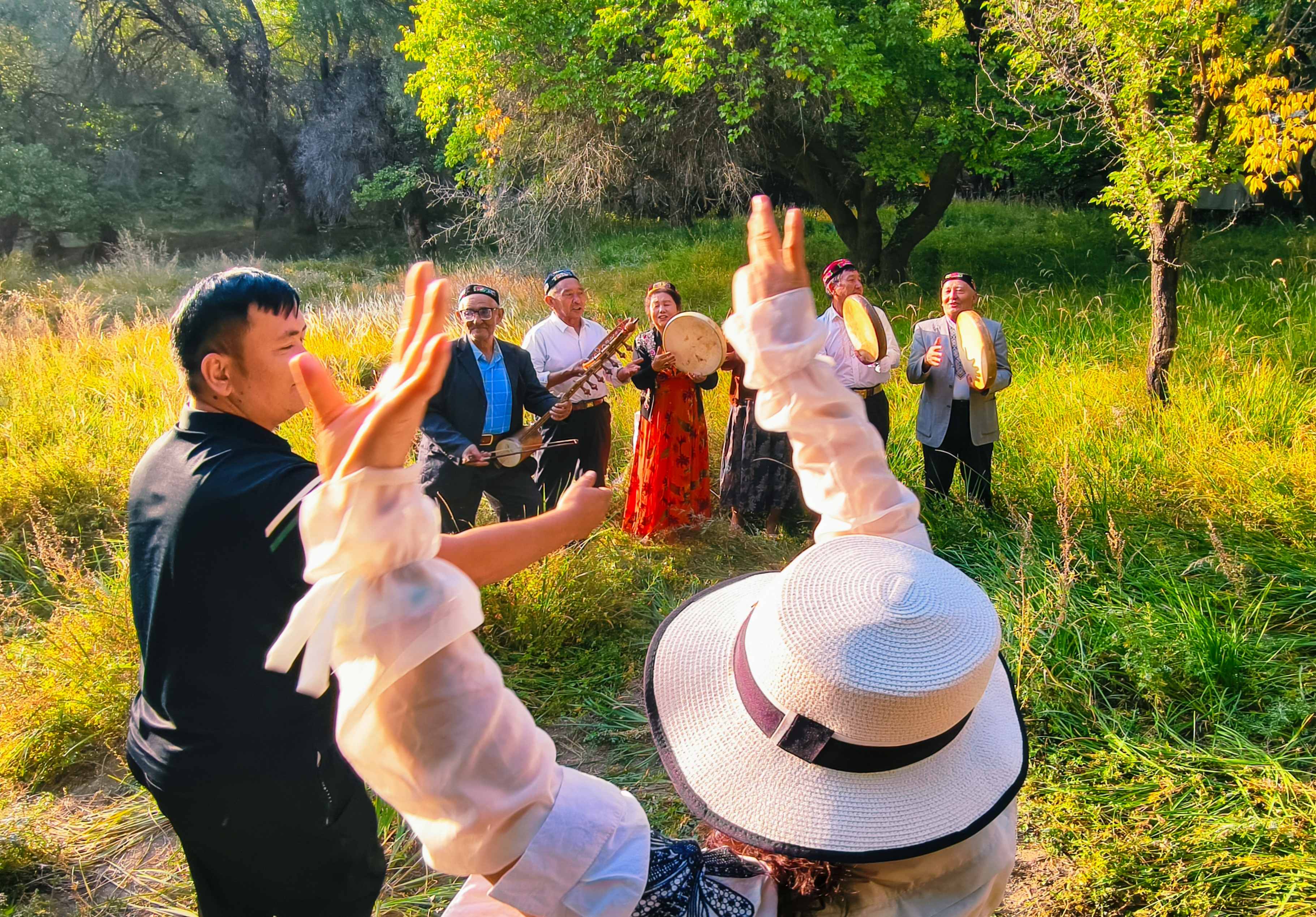 《歌声在林间回荡》 在新疆兵团第十三师新星市风景如画的林间空地上,二位能歌善舞的维吾尔族艺人正纵情演绎《哈密木卡姆》。他身着传统与现代服饰翩然起舞,手鼓声与歌声在林间回荡,仿佛与自然共鸣,展现着非物质文化遗产与天地交融的动人画卷。(吉龙生 摄)