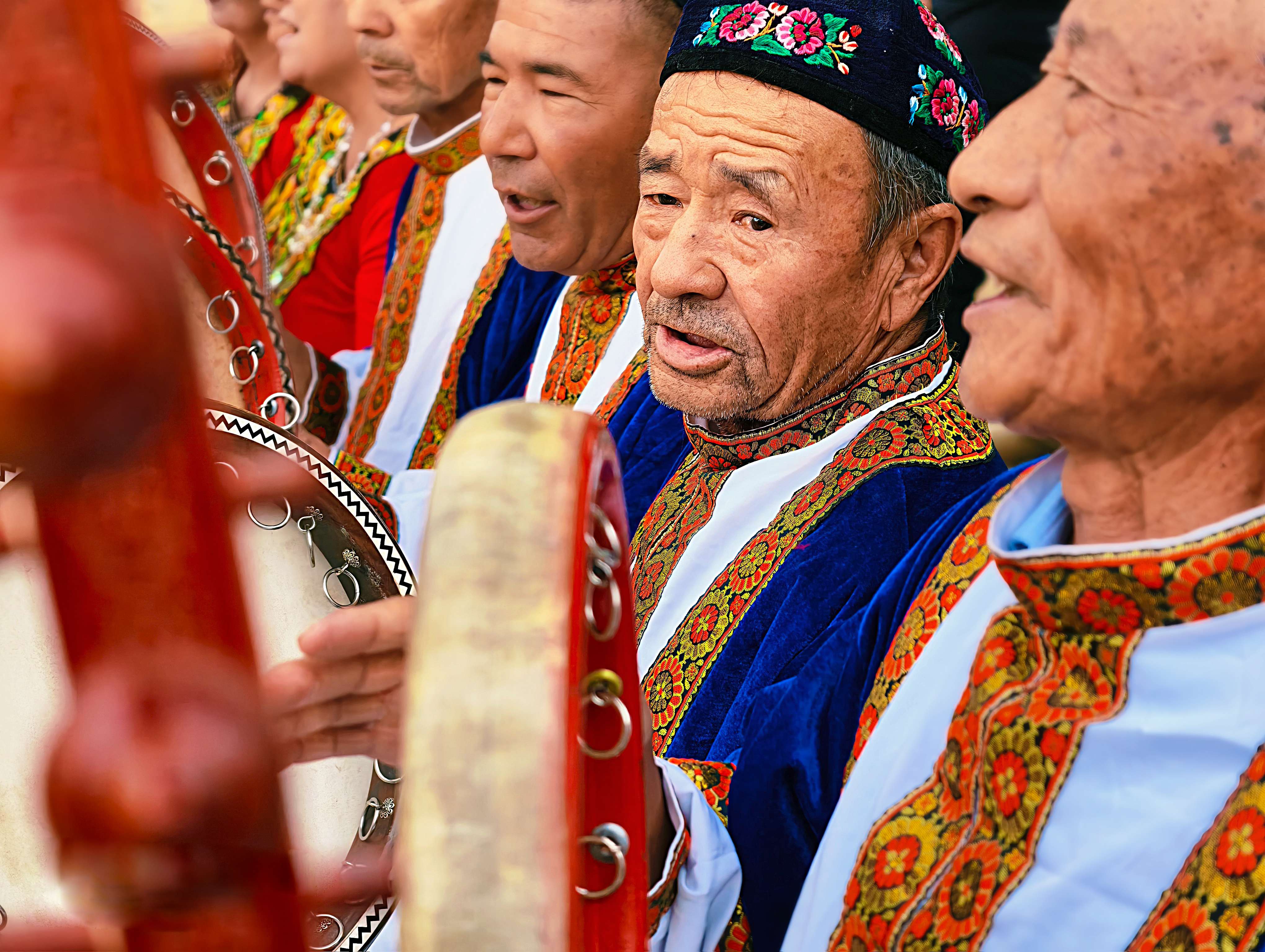 《非遗传承人》七旬非遗传承人克以木·以为都,毕生守护《哈密木卡姆》艺术。退休于兵团十三师黄田农场的他,已培养66名民族乐器学生,精通手鼓、艾捷克等多种技艺。常年奔走乡间舞台,用音乐点亮百姓文化生活,传递千年韵律之美。(吉龙生摄)