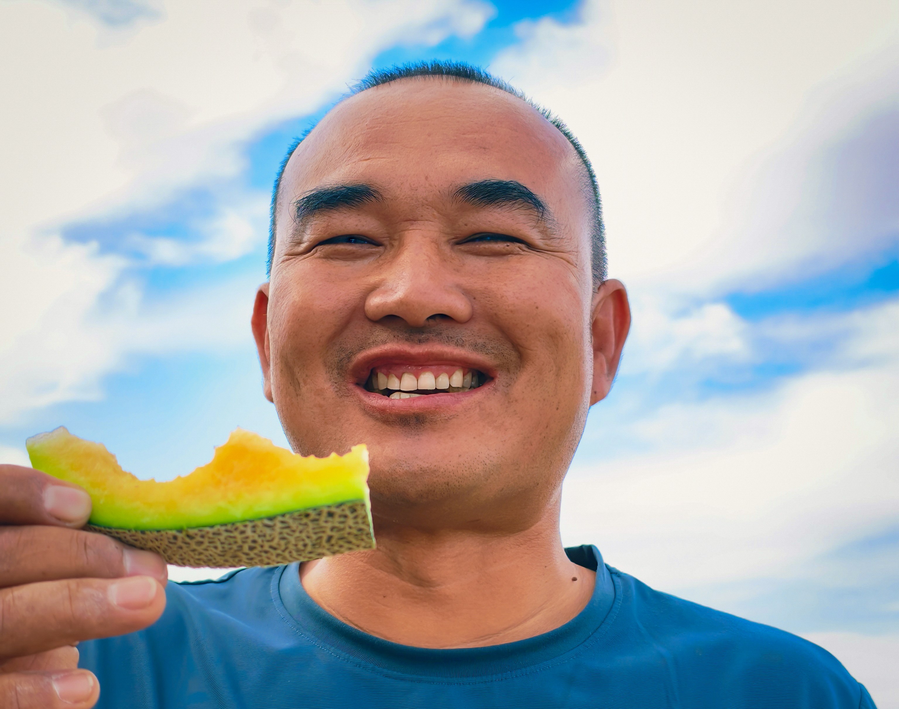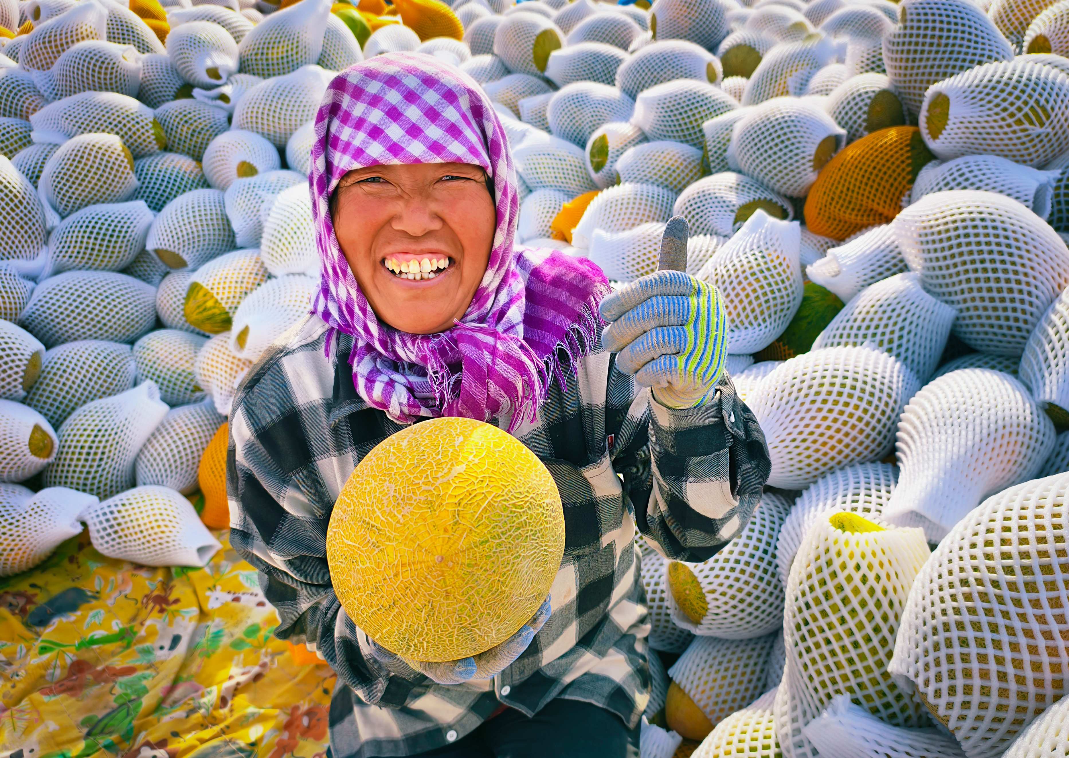 《甜密的事业》 在新疆兵团第十三师淖毛湖农场的瓜果销售点,53岁的刘英望着金灿灿的哈密瓜喜笑颜开。她双手轻抚着纹路精美的瓜皮,身后是绵延无际的丰收瓜果。阳光洒满田间,映照着她脸上自豪的笑容,展现兵团职工通过甜蜜产业实现致富梦想的生动场景。(吉龙生 摄)