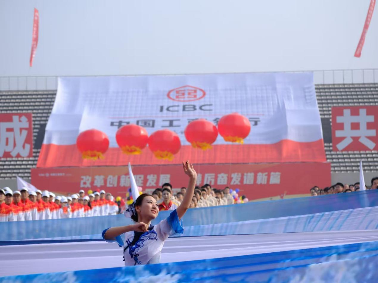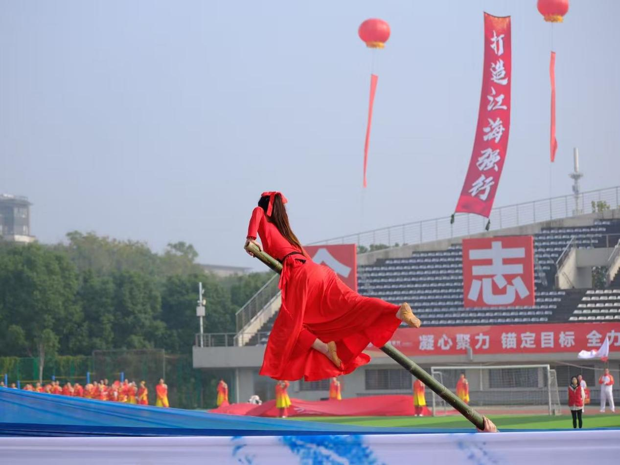 中段“红衣跃竿”。10名红衣组演员随鼓点跳起群舞,自然组成底座,用竹竿将1名舞者挑起至空中完成高难度造型。蓝印组同步抛布配合,展现体育力量之美。方阵组手持红伞做出旋转、挥舞等整齐划一的动作。两架无人机展开8米长条幅“培育第二曲线,打造江海强行”,从远处飞向主席台,将现场气氛推向高潮。