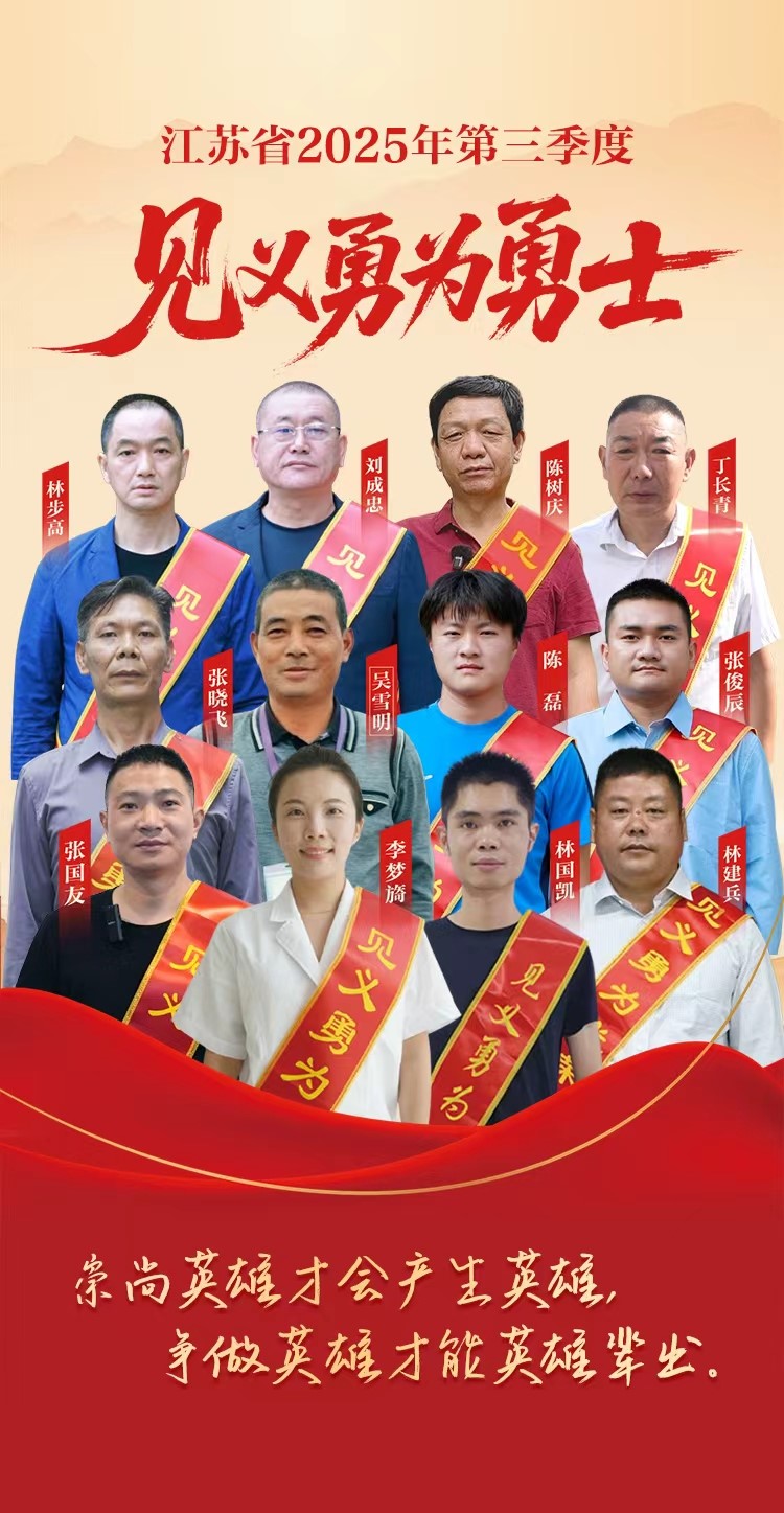 10月9日,江苏省见义勇为基金会发布2025年第三季度“省见义勇为勇士榜”,12名见义勇为勇士光荣上榜,他们中有奋不顾身,井下施救他人不幸牺牲的吴雪明;有临危不乱,救死扶伤医者仁心的广东韶关护士李梦旖;有果敢机敏,冲向爆燃车辆勇救受困司机的林国凯、张晓飞;有挺身而出,浓烟火场救助被困老人的张俊辰、陈磊;有危急时刻纵身一跃,勇救落水群众的林步高、刘成忠、丁长青、陈树庆、张国友、林建兵。他们都是来自各行各业的普通百姓,他们中有医院护士,有退役军人,有企业职工,有社区居民,有普通村民,也有个体工商户。他们有着不同的人生轨迹,但在危急、危险、危难的那一刻,他们都选择了勇敢、担当、善良,行正义之举,扬和善之美,有力激发了向上向善的平安力量,值得每个人去点赞。