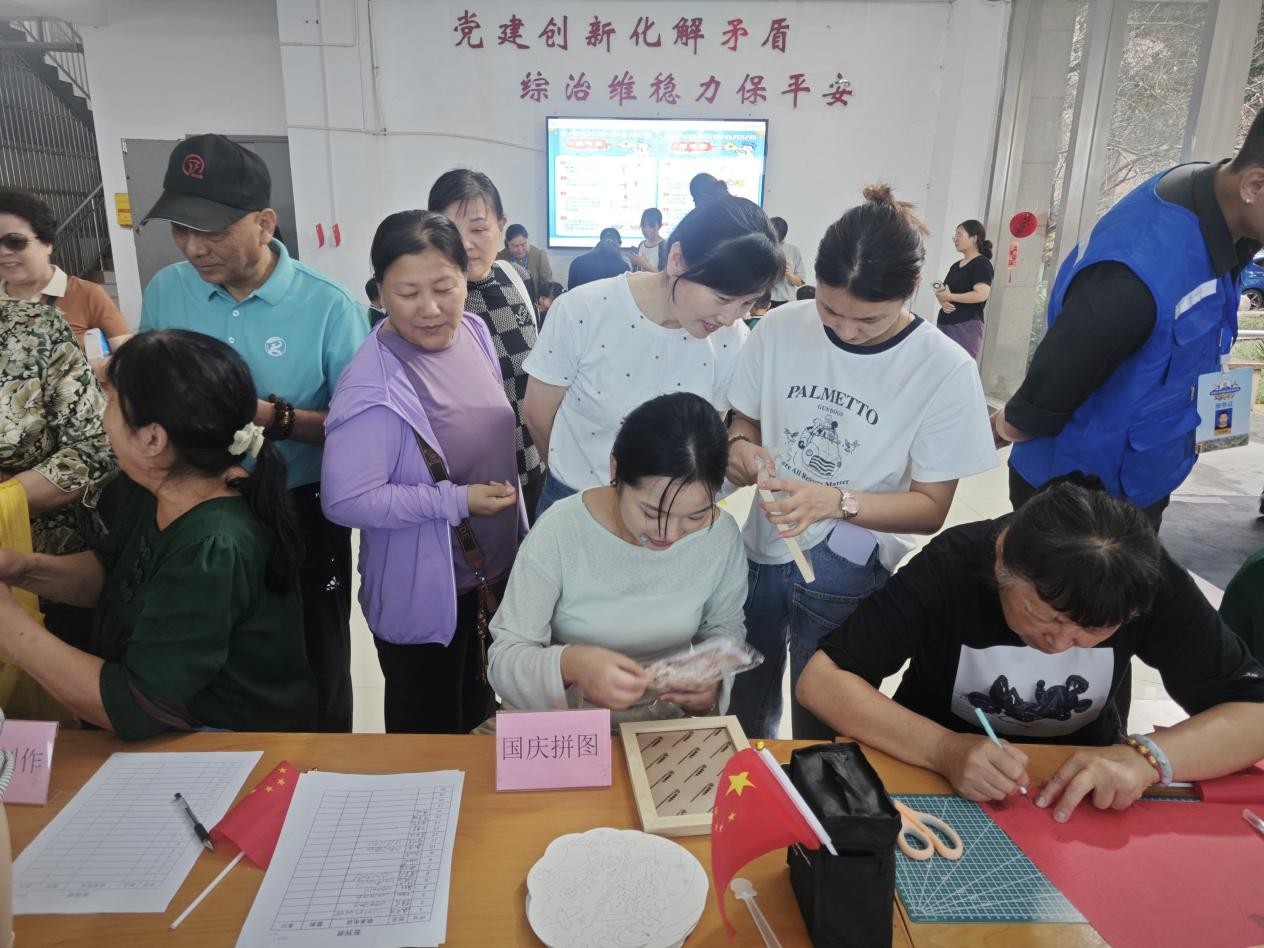 手工体验区作为活动的压轴环节,提供了最具互动性的体验机会。在楼长志愿者的指导下,孩子和居民们兴致勃勃地制作冰皮月饼,从揉面、包馅到压模,每一步都充满了欢声笑语。爱国主题剪纸区同样热闹非凡,居民们巧手翻飞,剪出象征吉祥的图案和对祖国的深情祝愿。养生茶包制作台前,大家按照工作人员提供的配方,精心搭配“桂花红枣”、“桂花陈皮”等健康茶饮。这些手工活动不仅锻炼了居民的动手能力,更在协作过程中增进了邻里情谊。居民刘阿姨拿着与邻居合作完成的月饼感叹道:“活动太有意义了!大家一起动手,有说有笑像一家人,社区越来越有温度。”这种互动体验让“陌邻”变“睦邻”,为构建“完整社区”注入了活力。