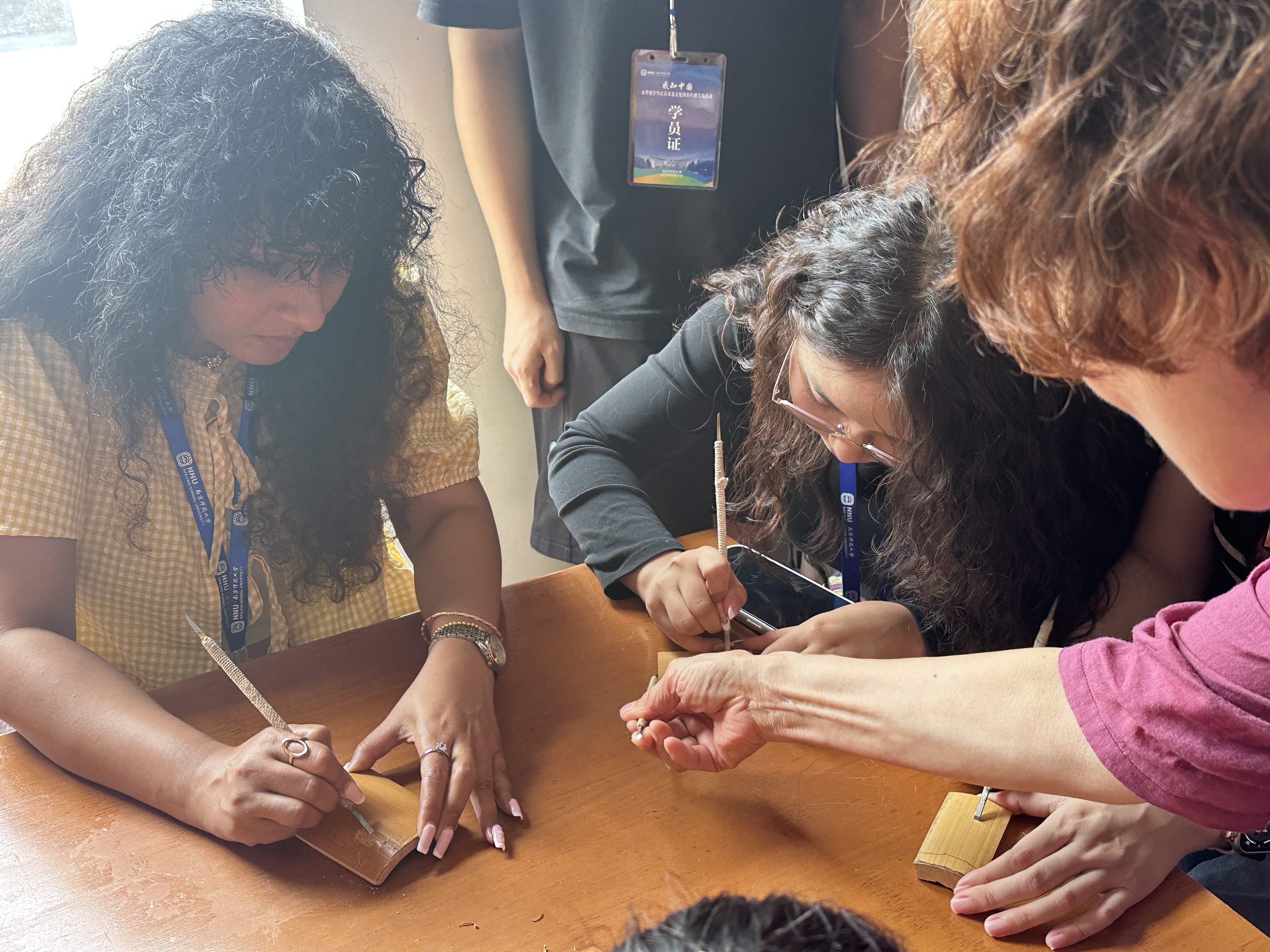 随后,中外师生移步至留青竹刻馆。竹刻展厅静谧安然,唯有刻刀划过竹青的细微声响。国际工艺美术大师、非遗传承人白雪飞在讲解中介绍,留青竹刻“以青皮为画,以竹肌为底”,于方寸之间呈现大千世界无穷意趣。留学生们对《鸟语花香》《趣牧图》等作品的精妙构图和深邃意境表现出浓厚兴趣,纷纷俯身细观。来自萨尔瓦多的ORELLANA CASTRO MARVIN ALFREDO表示:“这种艺术让人感受到自然与人的和谐。”在试刻环节,留学生们小心翼翼地执刀操作,来自赤道几内亚的Maria Jesus Emana Asue笑称:“这比我想象中更需要耐心,也让我理解了中国传统文化中的精益求精。”