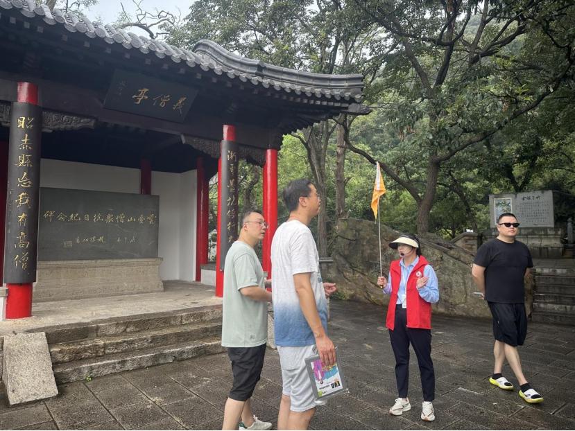 讲解员以专业而生动的讲述,将抗战时期的红色故事与景区文化脉络有机串联。通过情景再现、互动问答等形式,游客不仅聆听历史,更仿佛穿越时空,亲身感受那段烽火岁月中“天下兴亡、匹夫有责”的担当精神。游客李先生感慨道:“通过讲解我不仅了解到花果山的抗战历史,更让红色精神变得鲜活,直击心灵。”