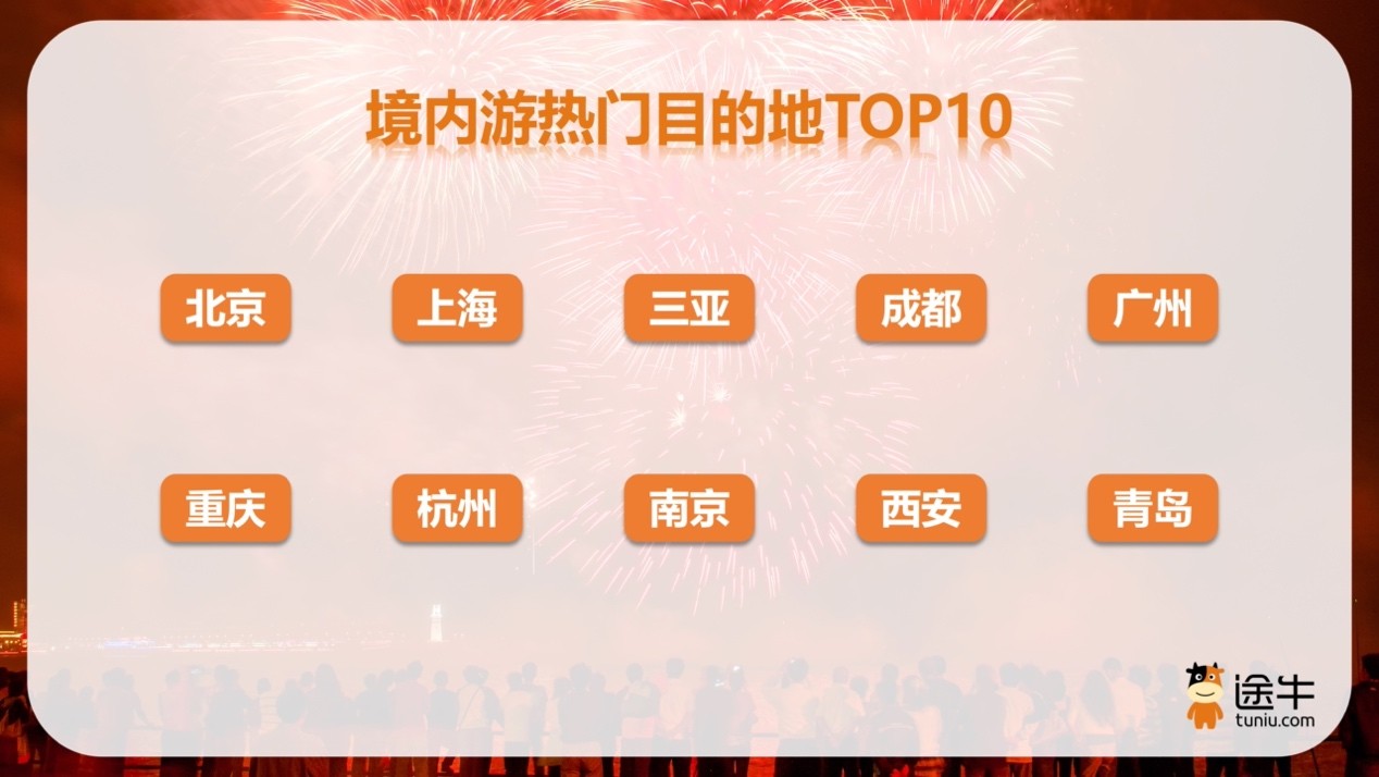 境内游热门目的地中,北京、上海、三亚、成都、广州、重庆、杭州、南京、西安、青岛等是截至目前途牛用户国庆中秋假期出游的更热门选择。出游主题方面,赏秋游、传统文化游以及红色旅游等更受游客青睐。