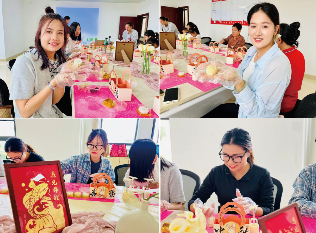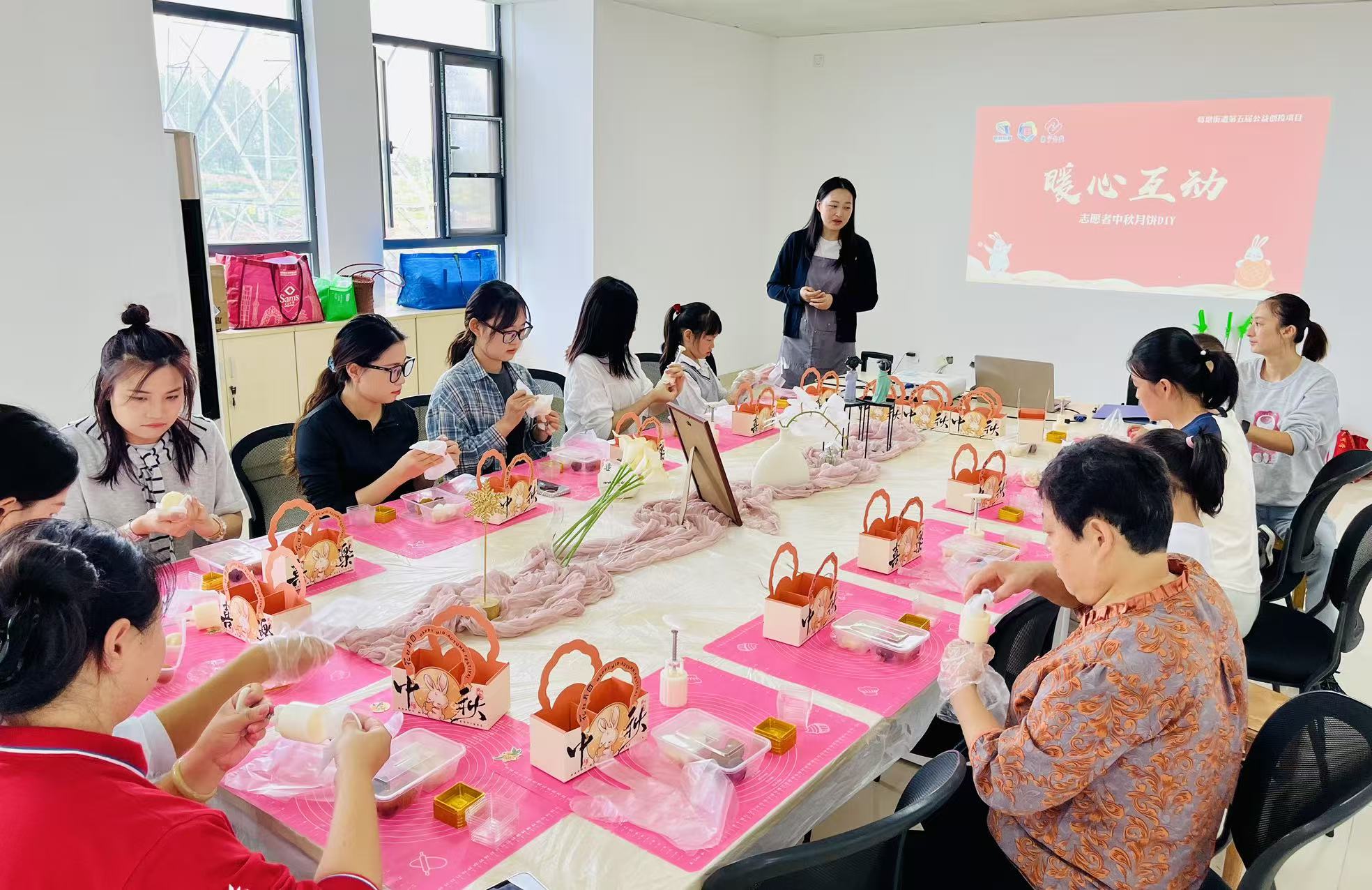 志愿服务结束,开启暖心中秋月饼diy,活动特邀南京非物质文化传承人郭丽君老师现场为大家教学。现场布置温馨精美,月饼制作材料一应俱全,志愿者纷纷动手实践。有的先将面团在掌心揉圆压扁,再装入馅料小心包裹,大家认真聆听郭老师的制作经验分享,手把手教学。志愿者围在一起,用模具压出精美的花纹,不时发出阵阵惊叹。现场没有丝毫拘谨,邻里间的交流声、欢笑声交织在一起,格外温馨。