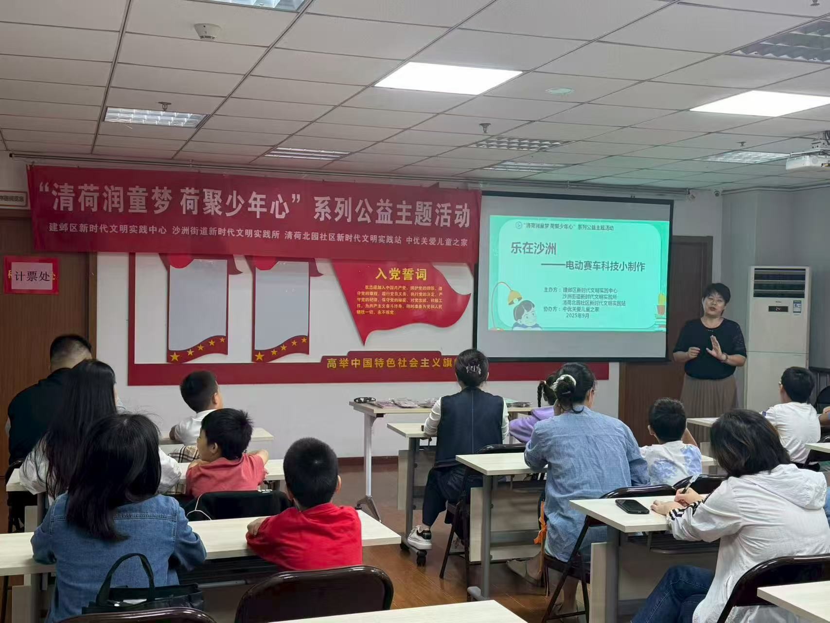 江南时报讯“老师,这个小车真的不用电就能跑吗?”“太阳能是怎么让轮子转起来的呀?”9月20日,南京市建邺区沙洲街道清荷北园社区活动室内,一连串充满好奇的提问此起彼伏,一场趣味十足的“太阳能小车制作课”正在热闹开展。清荷北园社区党总支坚持党建引领“为小”服务,携同中优关爱儿童之家,举行了“清荷润童梦 荷聚少年心”系列公益主题活动“乐在沙洲———电动赛车科技小制作”趣味科学之旅。