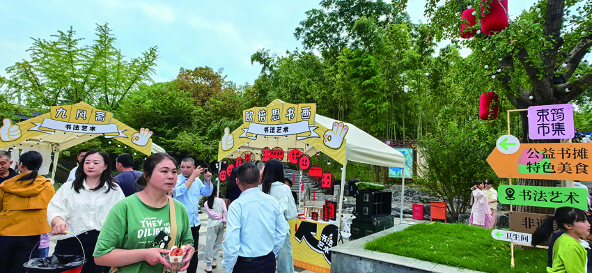 融“艺”与“食”,“束筠市集”解锁文化消费新场景。与展厅内的静谧形成鲜明对比,室外“束筠市集”充满烟火气。20余个特色摊位涵盖四大主题:书法艺术摊位上,一幅幅精美的书法作品让人目不暇接;非遗手作摊位前,手工艺人现场展示着精湛的技艺,游客可以亲手体验,感受传统文化的魅力;文创产品摊位则充满了创意与趣味,各种以书法元素为主题的文创产品让人爱不释手;而地方美食摊位更是香气四溢,各种特色小吃让人垂涎欲滴。艺术与生活在此交融,游客既能“赏墨韵”,也能“淘好物”“品美味”,实现文化体验与消费需求的双重满足。