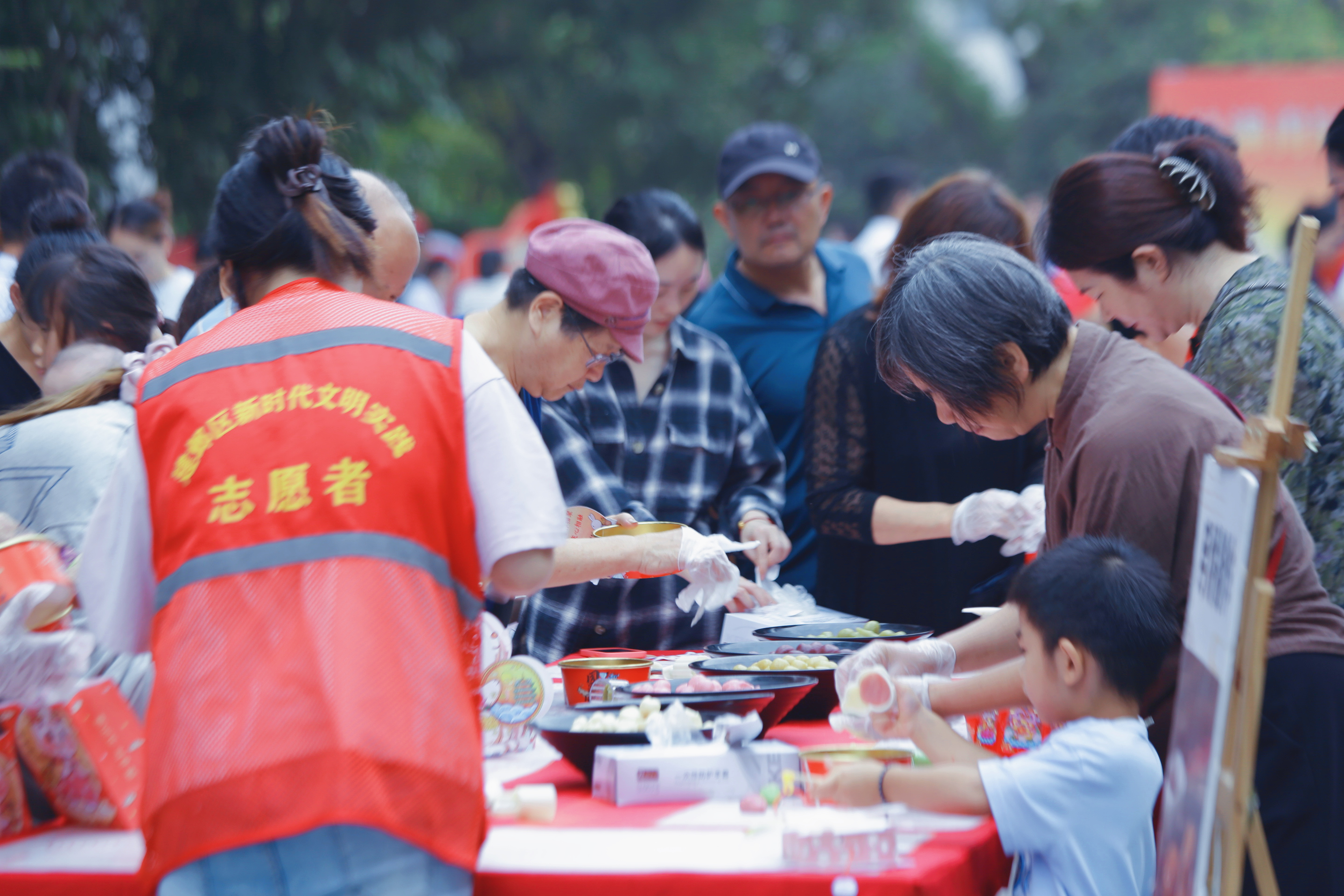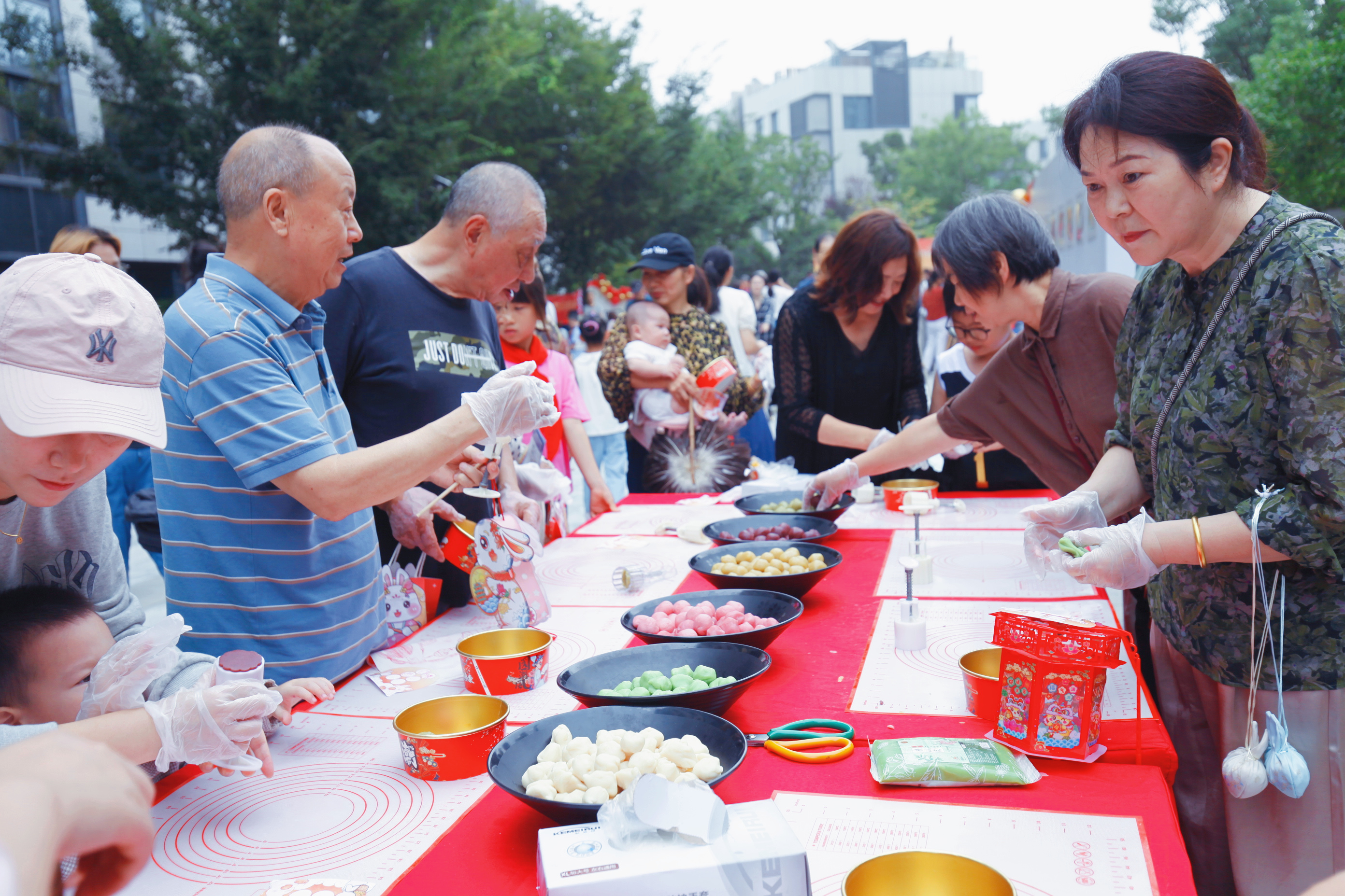 文化体验区人气高涨,中秋韵味与爱国情怀在这里交织共鸣。月饼制作摊位,居民们揉面、包馅、压模,将美好的祝福裹入香甜的月饼中;香囊制作区,大家穿针引线,细心填充香料,一个个寓意吉祥的香囊悄然成型;雕版印刷、漆扇DIY、花灯制作等传统文化体验项目也备受青睐,居民们在动手创作中感受着传统文化的独特魅力。