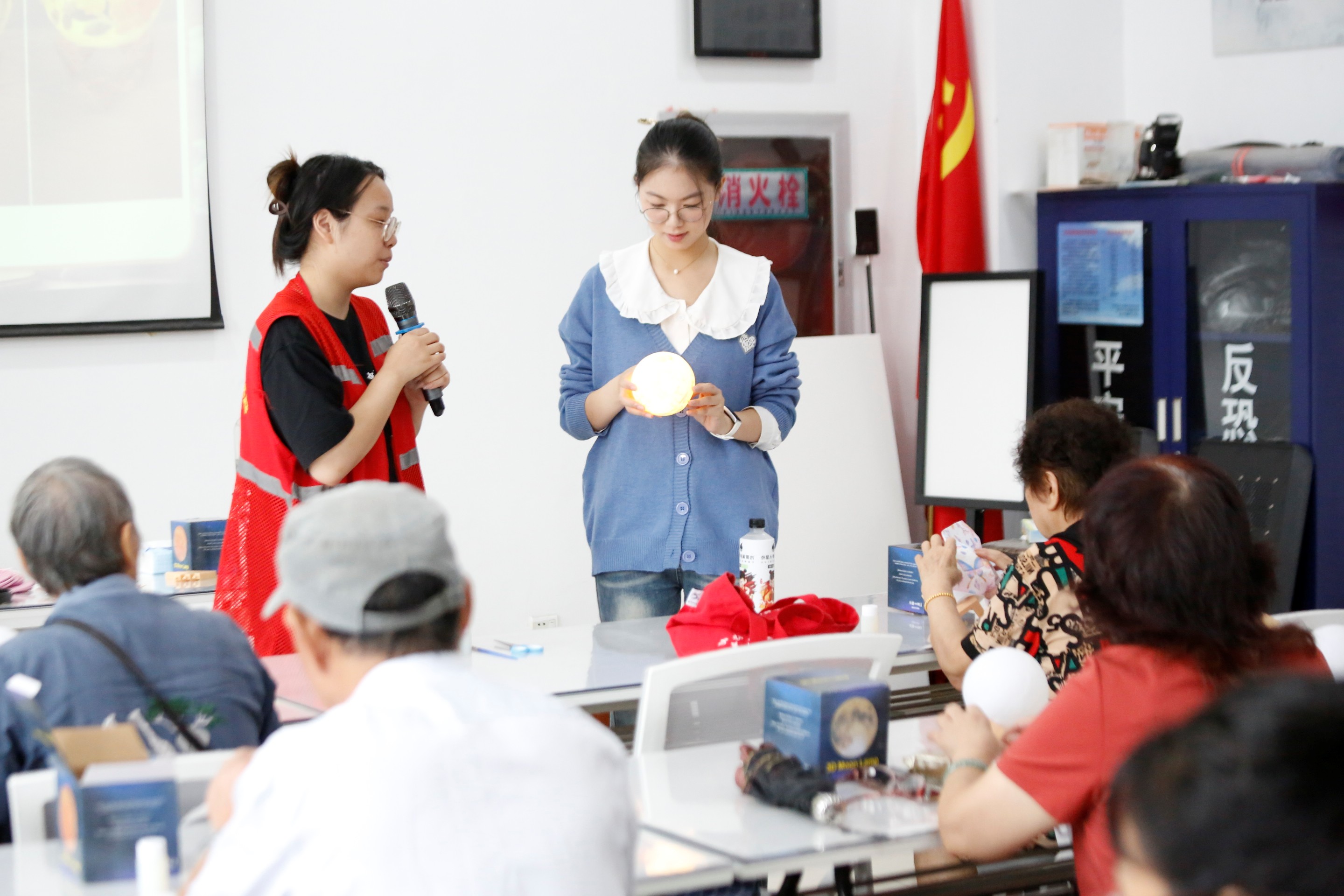 随后中秋月圆灯制作,志愿者一边示范,一边细致讲解制作要点,随后分组走到居民身边,手把手指导大家操作。不一会儿,一个个形态各异的月圆灯逐渐成型,待装上灯座点亮,温暖的光晕透过镂空图案洒出,恰似悬于掌心的迷你明月,引得大家纷纷赞叹。