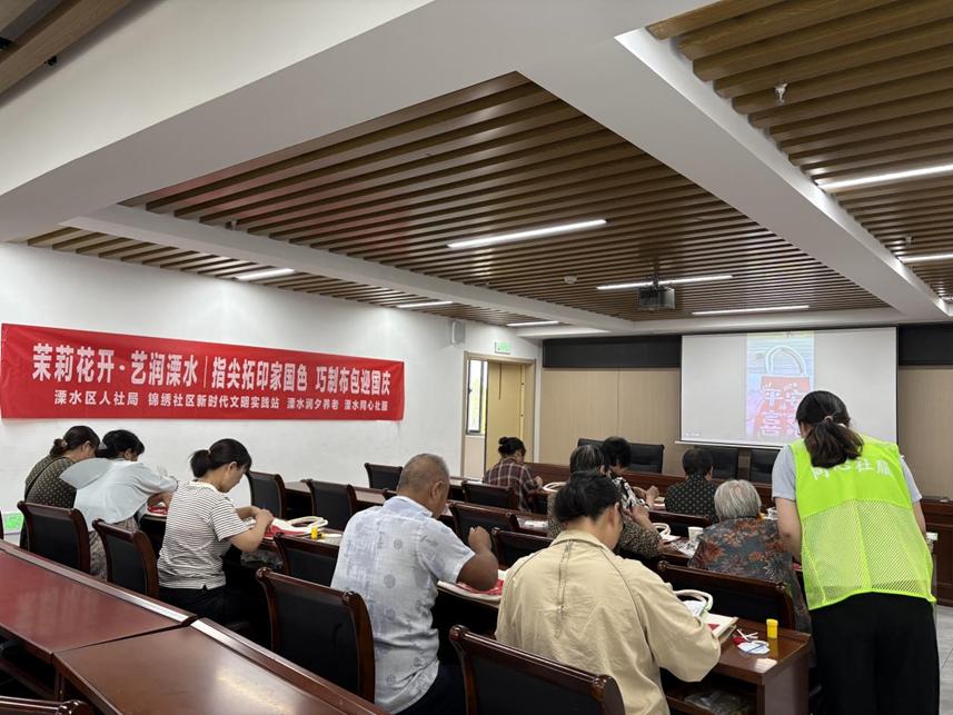 为丰富社区居民的精神文化生活,增进邻里间的情感交流,9月28日,溧水区人社局、锦绣社区新时代文明实践站、溧水润夕养老、溧水同心社服组织了“茉莉花开•艺润溧水丨指尖拓印家国色 巧制布包迎国庆”主题活动,大家用巧手与创意,共同绘制对祖国的美好祝福。