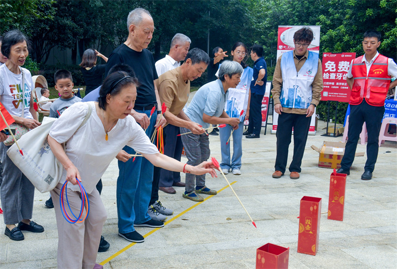 最受瞩目的当数“迎佳节趣味活动区”。投壶游戏现场,参与者凝神屏息,箭矢划出优美弧线,尽显古韵雅趣;套圈场地里,孩子们欢呼雀跃,精准投掷赢得阵阵喝彩。这些融合了传统民俗与现代趣味的游戏,吸引了众多家庭参与。大人们仿佛回到了童年,孩子们则尽情释放天性,网格志愿者穿梭其间,分发奖品、加油鼓劲,现场化作一片欢乐的海洋,邻里之情在互动中持续升温。