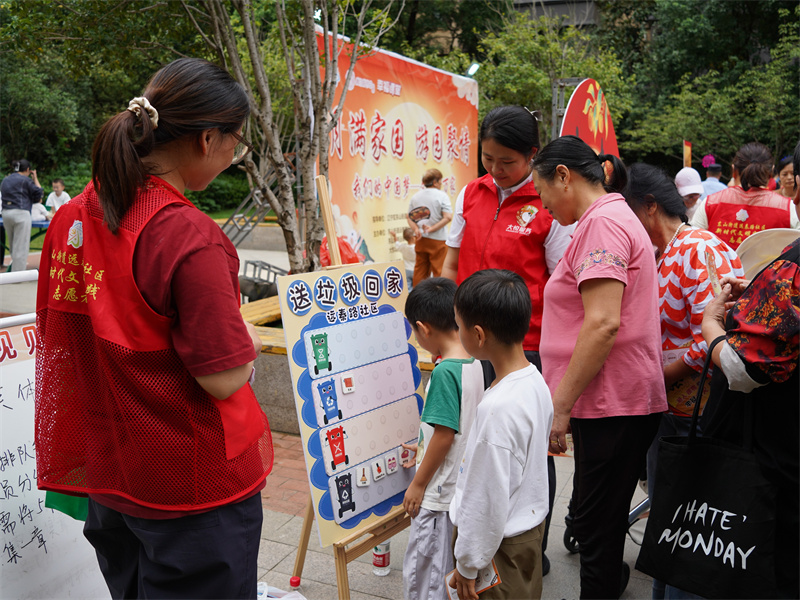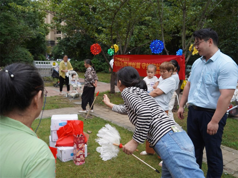 游戏区里,非遗捶丸、趣味射箭等项目的参与者络绎不绝,大家主动分享游戏技巧;垃圾分类、趣味钓熊猫等项目由社区工作人员和居民志愿者携手主持,志愿者化身“环保导师”,与居民一同解锁文明知识。