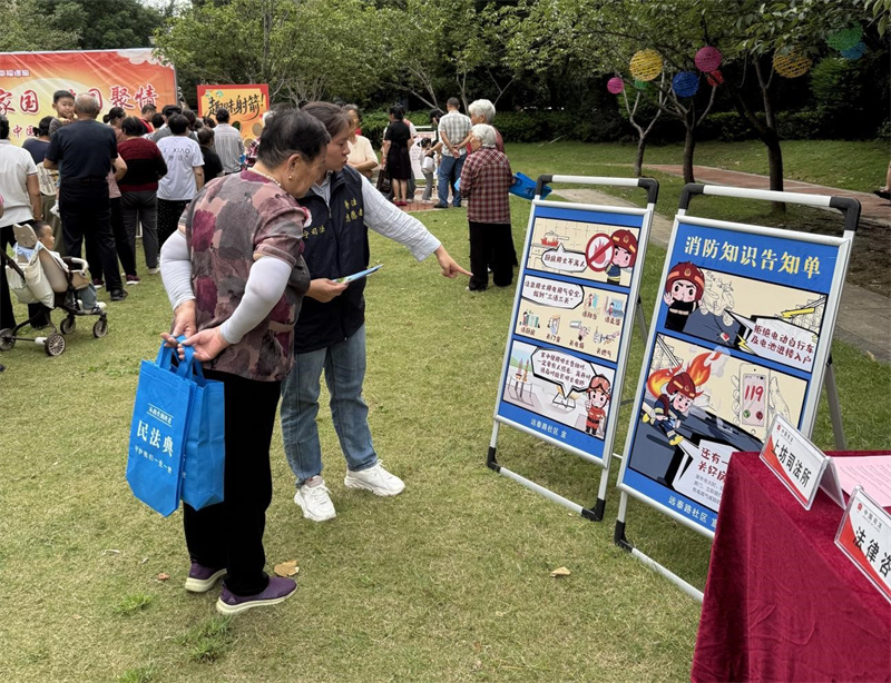 步入会场,志愿者们身着红马甲忙碌不停,入口打卡点协助居民拍照,零食台、饮水台旁及时补充物资,贴心服务让“双节氛围感大片”更添暖意。上坊派出所和上坊司法所在会场开设普法宣传,为居民普及节日相关法律知识,并进行现场安全管理,让文化活动兼具科普性。同时,社区还贴心邀请了上坊医院医生组成应急团队,严格落实应急预案,保障居民安全,让居民玩得开心,玩得放心。