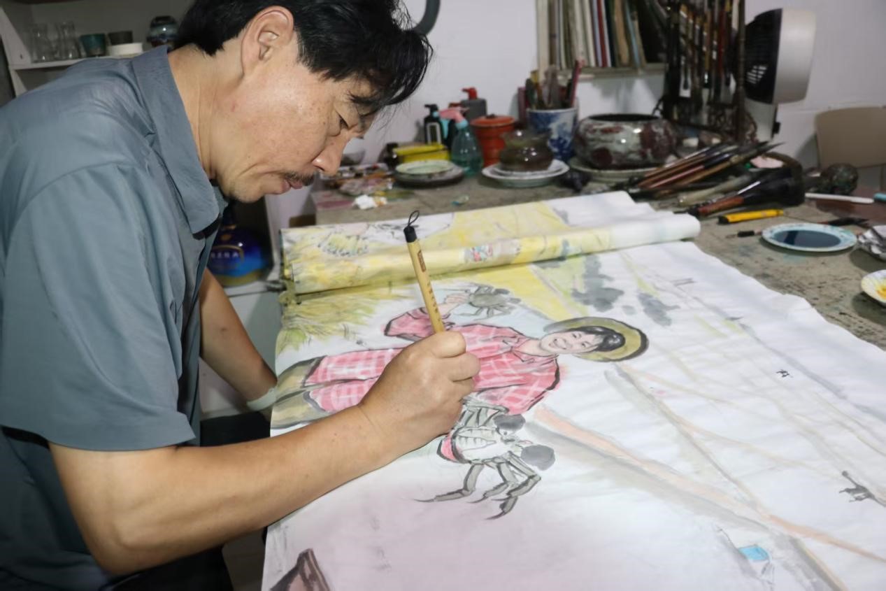 “国庆是举国欢庆的日子,而丰收是最能体现喜悦与希望的主题。高淳的乡村风光很有特色,既有传统农业的厚重,又有现代化发展的活力。创作前,我专门去了高淳现代农业产业园的蟹塘,观察螃蟹的生长状态,看农户们现代化的捕捞方式;还去了砖墙镇的水稻田,俯身摸过稻穗,感受过稻秆的坚韧。我就是想通过画笔,把高淳的丰收之美、发展之美展现出来,让更多人看到乡村振兴给高淳带来的新变化,也用这幅画向国庆献礼”。画家李继宁在一旁说道。