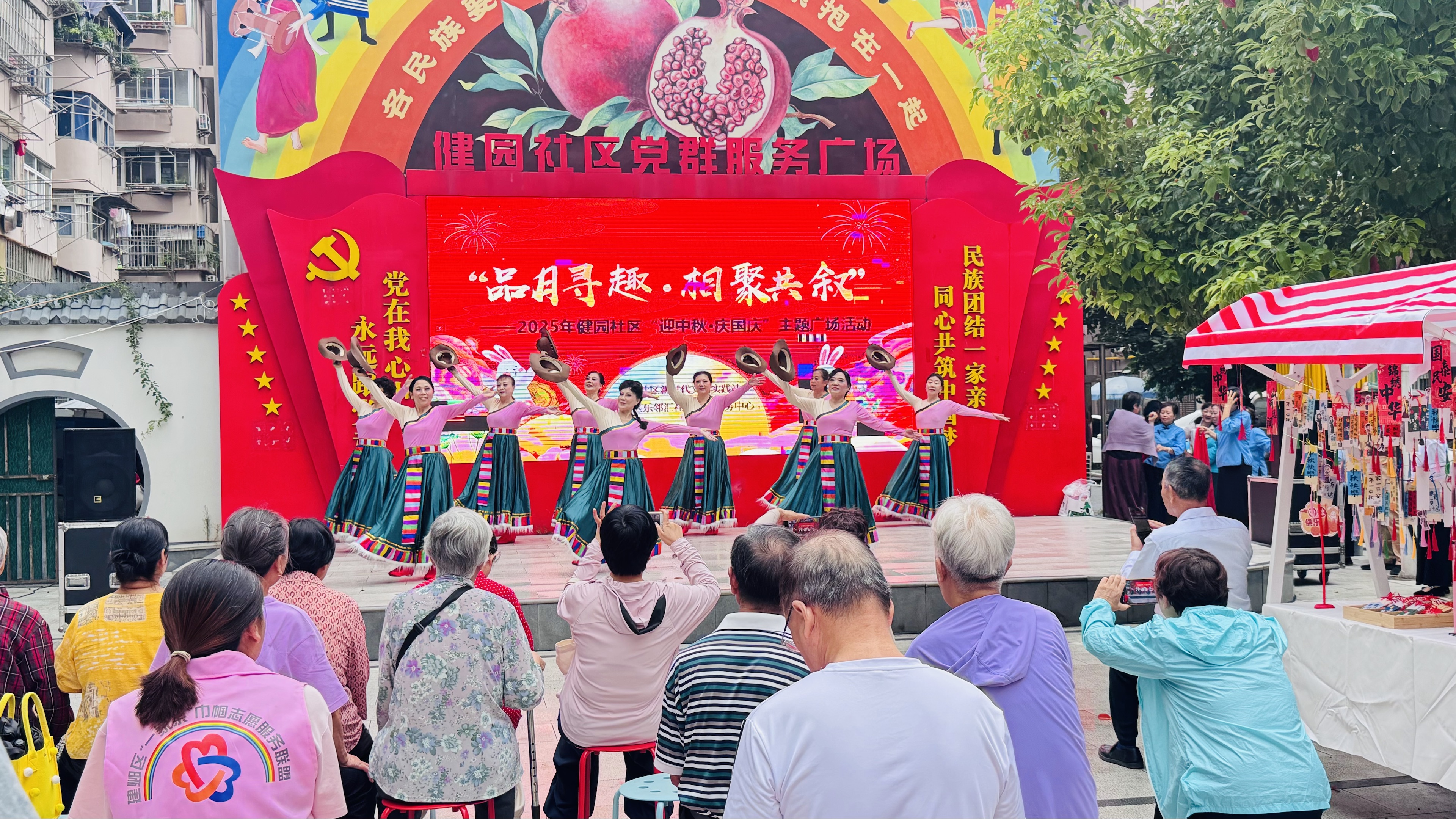 活动在充满民族音乐元素的中秋氛围音乐中拉开帷幕。主持人热情欢迎各族居民的到来,并强调了此次活动对于民族团结、共庆中秋的重要意义。开场的民族舞蹈表演《太阳姑娘》瞬间点燃了现场气氛,舞者以灵动的舞姿展现出民族艺术的魅力;随后的朗诵《江姐》深情动人,传递着红色精神与家国情怀。