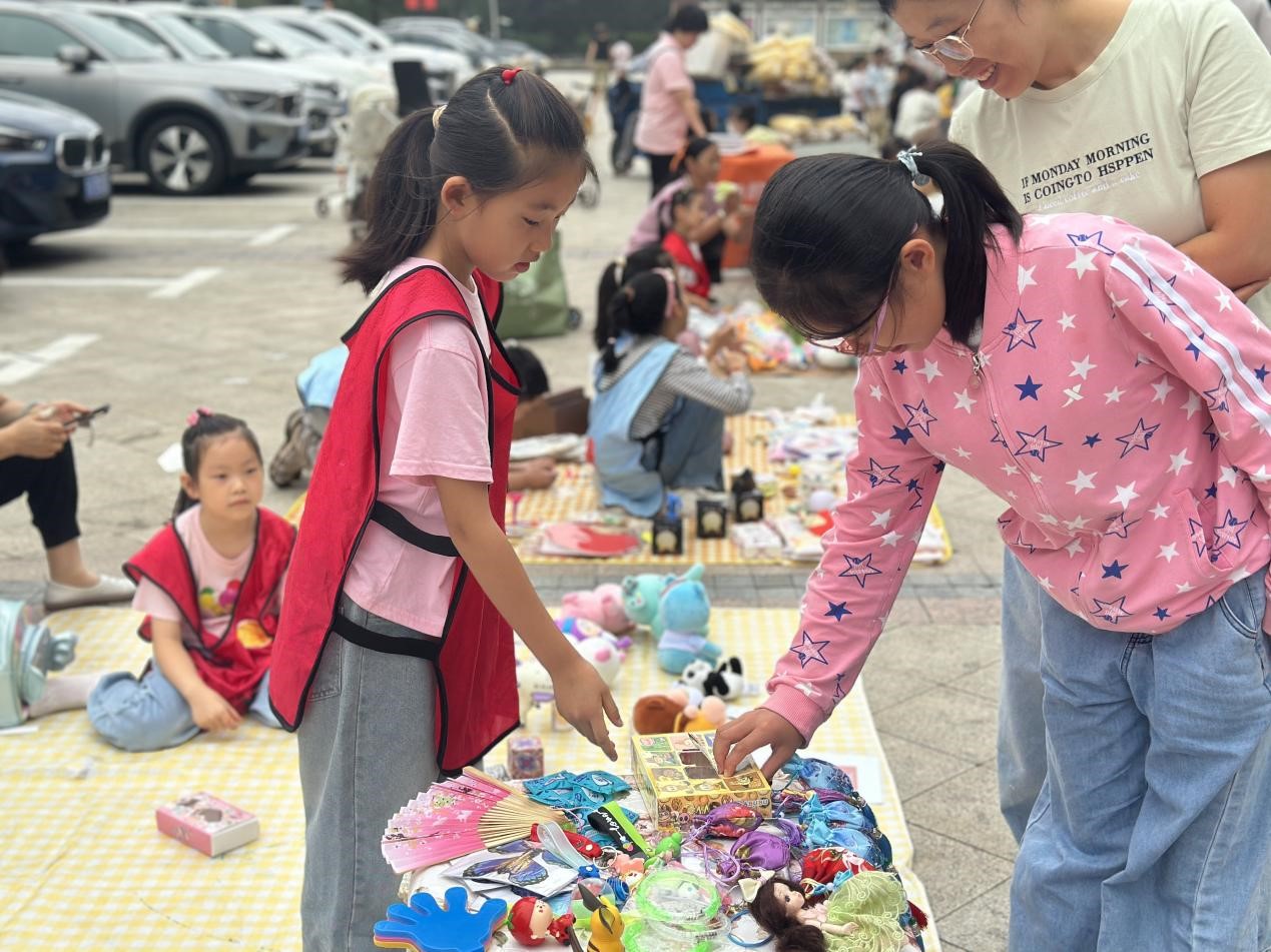 活动现场,一张张黄白格子布铺就的“小摊位”依次排开,手绘灯笼泛着暖光、绘本图书整齐堆叠、毛绒玩具憨态可掬,各类闲置物品错落摆放,满是童趣。穿粉色志愿马甲的小“摊主”格外积极,双手高举写有“爱心”字样的纸盒,脆生生地吆喝:“买玩具就是献爱心,大家快来看看呀!”身旁的母亲举着手机,轻轻定格孩子认真递出商品、与“顾客”礼貌交流的瞬间。每个家庭自发带来的闲置物品,在孩子们的巧思摆放和热情推销下被重新赋予温暖意义,每一笔交易都承载着公益初心。据社区工作人员介绍,此次义卖所得将全额注入“困境群体帮扶基金”,形成“居民参与—社区统筹—精准帮扶”的治理闭环。