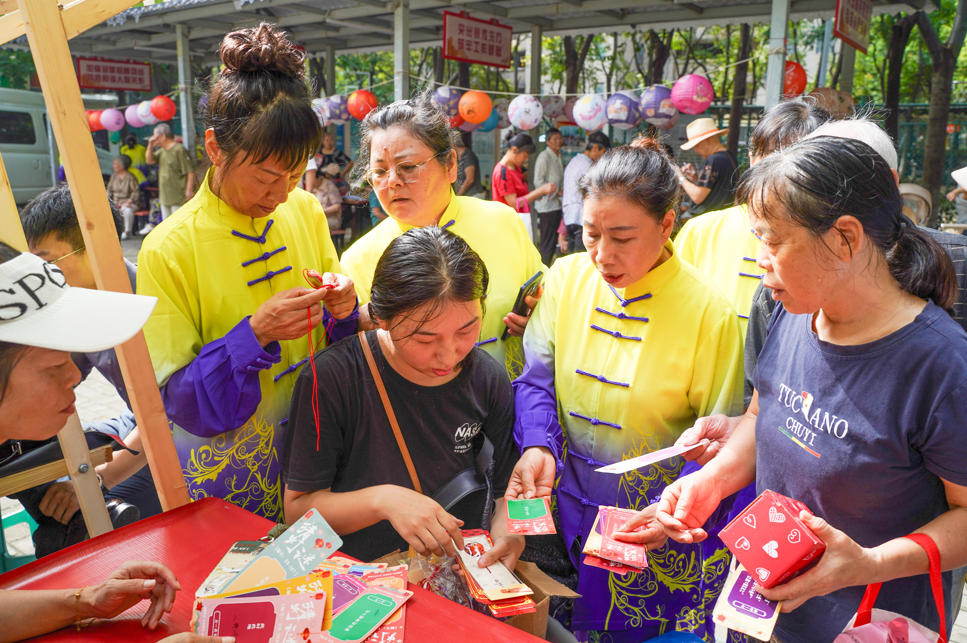 与文艺演出同步进行的“乐在沙洲”慈善市集同样人头攒动。市集聚焦居民实际需求,整合多方资源,设有慈善义卖、中医义诊、法律咨询、家庭医生签约咨询、全家福拍摄、月饼品鉴等多样化便民摊位,并将反诈、垃圾分类宣传等民生服务融入其中。社区民警与区委党校志愿者现场讲解互动,提升居民防骗意识。