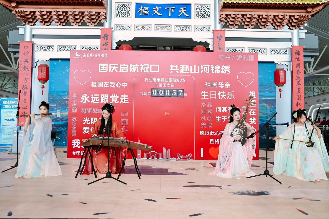 活动伊始,一场精彩的民乐表演拉开序幕。在“天下文枢”标志景观前,传统乐器齐鸣,既奏响《歌唱祖国》《我的祖国》等经典红色曲目,也演绎《茉莉花》《太湖美》等江苏特色旋律。悠扬乐声传递着对祖国的热爱,更渲染出浓厚文化艺术氛围,引得众多旅客驻足欣赏,以掌声与欢呼声抒发对祖国的祝福。