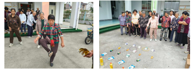 当天上午,广场上早早划分出两大活动区域。踢毽子区前,村民们自觉排起队伍,阿姨们展现娴熟技巧单脚踢毽子,志愿者计时,1分钟内踢数多者胜,中途落地可捡起来接着踢,还设一、二、三等奖,奖品为洗洁精等实用物资。徐阿姨1分钟内踢了56个,获得一等奖,脸上满是笑容。另一边的套圈区更是人气爆棚。生活用品(洗洁精、肥皂、垃圾袋等)作为目标实用奖品整齐摆放,村民们站在划定线后,眯眼瞄准、抬手投掷,套中的欢呼声与没套中的惋惜声此起彼伏。志愿者们则忙着补充被领走的奖品、维持秩序,确保每位村民都能公平参与、开心体验。