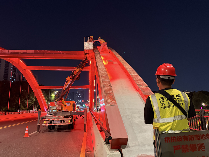 江南时报讯 近日,南京市浦口区综合行政执法局兴浦市政公司巡查时发现,彩虹桥桥面油漆剥落、开裂老化。为及时消除安全隐患,恢复桥梁美观,兴浦市政制定维修方案,夜间错峰开展专项整治。目前,项目成效已基本显现,完成铝塑板安装30平方米、横梁调整加固及密封打胶50米,打磨及批腻子等基层处理600平方米,预计10月中旬完成后续扫尾工作。