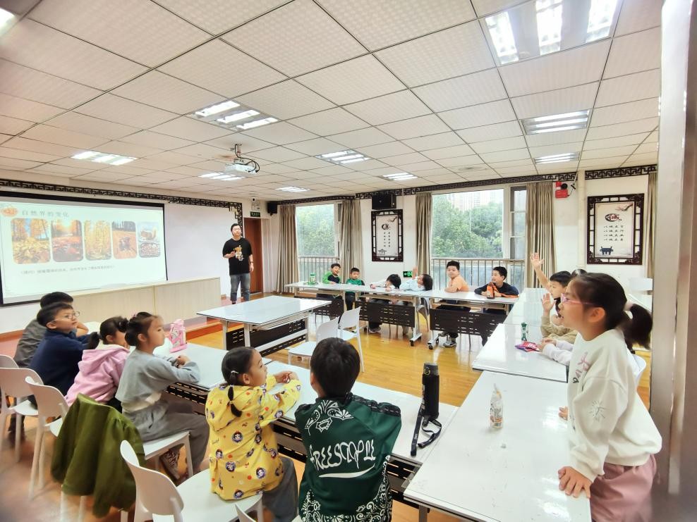 在面向青少年的“霜降拾趣制书签”活动中,科普老师首先通过生动的图文展示,系统讲解了霜降节气的物候特征、气候特点以及赏菊、吃柿子、进补等传统习俗,引导孩子们感知自然律动,理解古人智慧。随后进行的“自然观察”环节,枫叶、银杏、梧桐等近三十种植物标本整齐陈列,孩子们分组细致观察叶脉纹路与颜色变化,并踊跃分享发现,展现出对自然奥秘的浓厚兴趣。